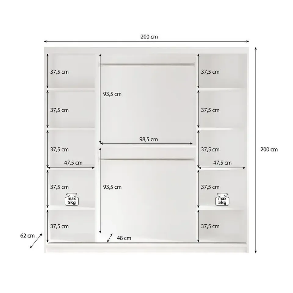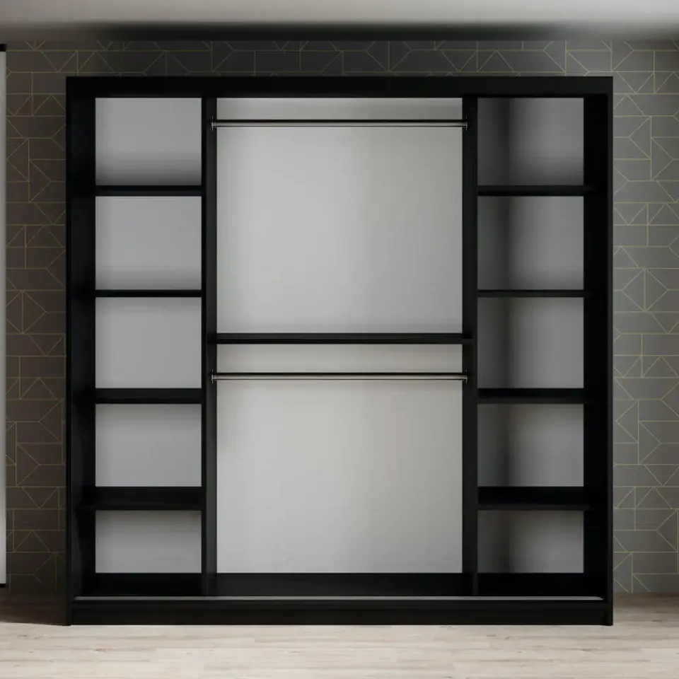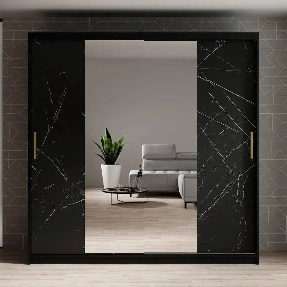 Kledingkast Marmer beschikt over 2 schuifdeuren die openen met goudkleurige handgrepen. Beide deuren zijn gedeeltelijk voorzien van een spiegel. De binnenkant bestaat uit 10 opbergvakken en 2 kledingroedes. Het meubel wordt ongemonteerd geleverd. Je dient het dus met behulp van de bijgeleverde handleiding zelf in elkaar te zetten.