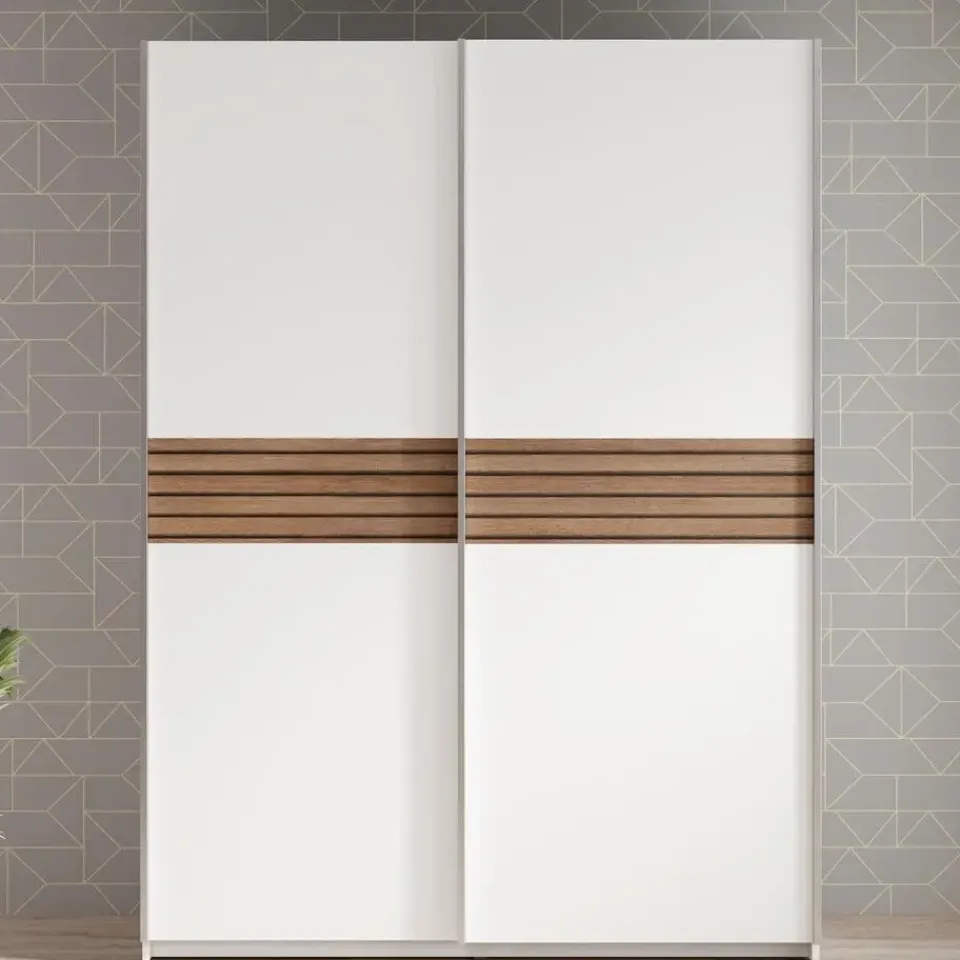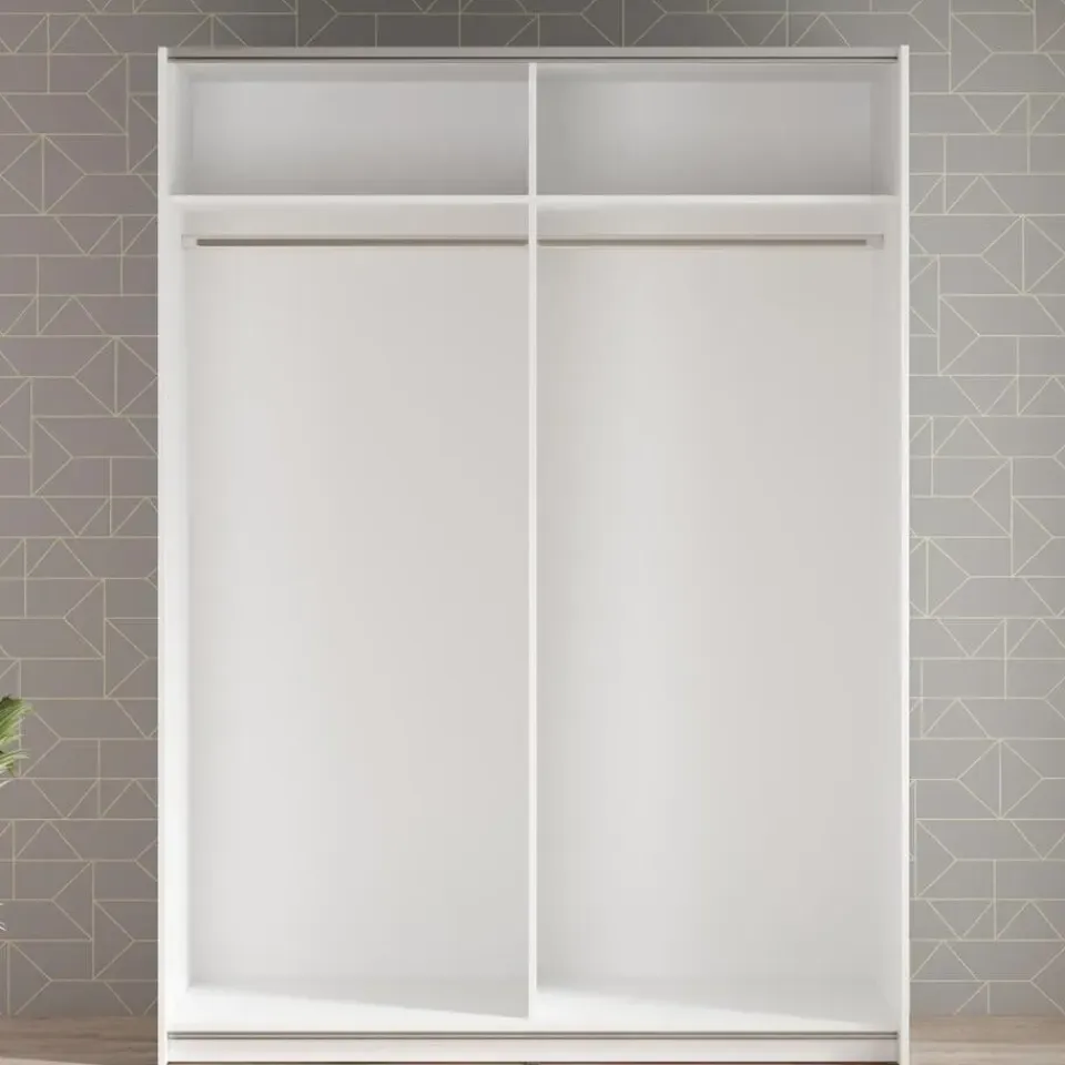 Kledingkast Mendoza beschikt over 2 greeploze schuifdeuren. De binnenkant bestaat uit 2 opbergvakken en 2 kledingroedes. De kast is uitgevoerd in een witte kleur en heeft een moderne uitstraling. Het meubel wordt ongemonteerd geleverd. Je dient het dus met behulp van de bijgeleverde handleiding zelf in elkaar te zetten.