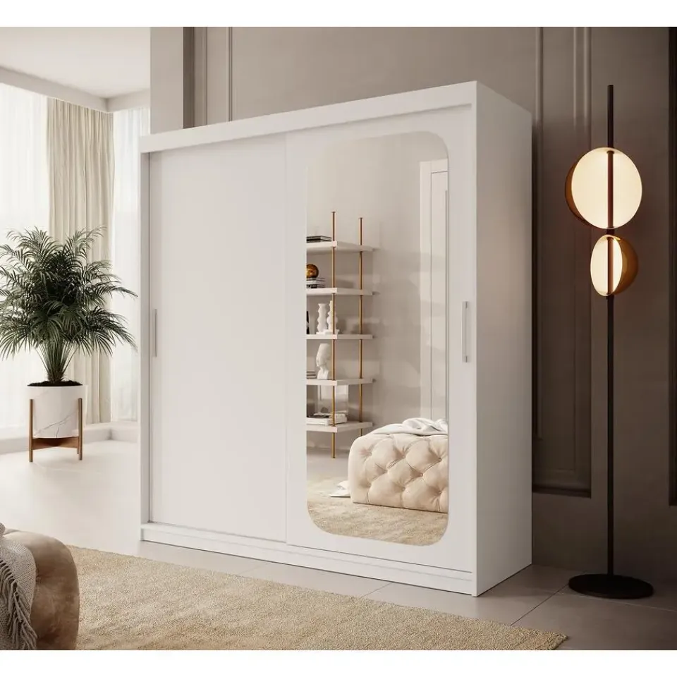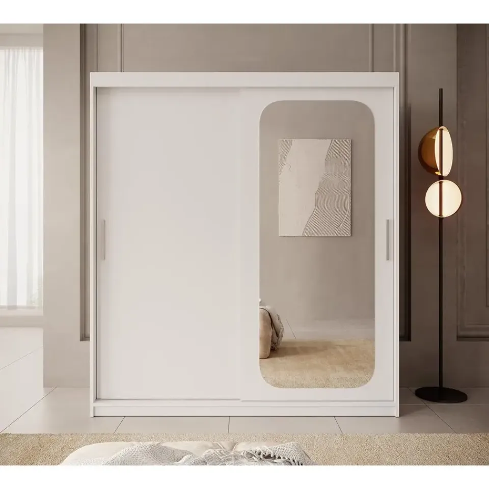 Kledingkast Pete is voorzien van 2 schuifdeuren welke openen met zilverkleurige handgrepen. De binnenkant bestaat uit 10 opbergvakken en 2 kledingroedes. De rechterdeur heeft een handige spiegel. De garderobekast is uitgevoerd in een moderne stijl. Het meubel wordt ongemonteerd geleverd. Je dient het dus met behulp van de bijgeleverde handleiding zelf in elkaar te zetten.