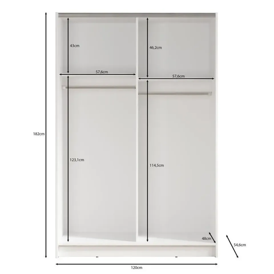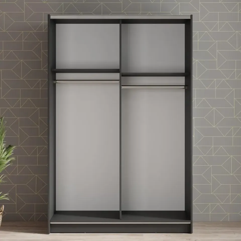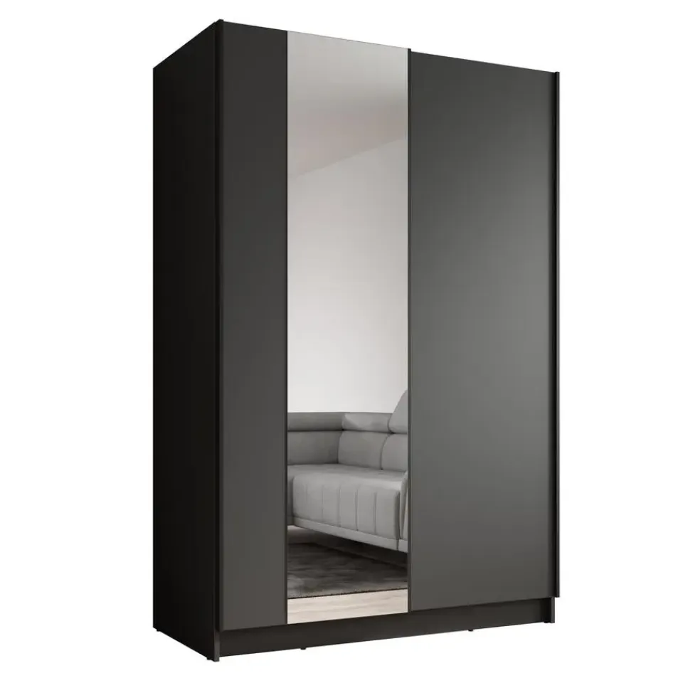 Kledingkast Salta beschikt over 2 schuifdeuren waarvan de linker voorzien is van een spiegel. De binnenkant bestaat uit 2 opbergvakken en 2 kledingroedes. De kast is uitgevoerd in een zwarte kleur en heeft een moderne uitstraling. Het meubel wordt ongemonteerd geleverd. Je dient het dus met behulp van de bijgeleverde handleiding zelf in elkaar te zetten.