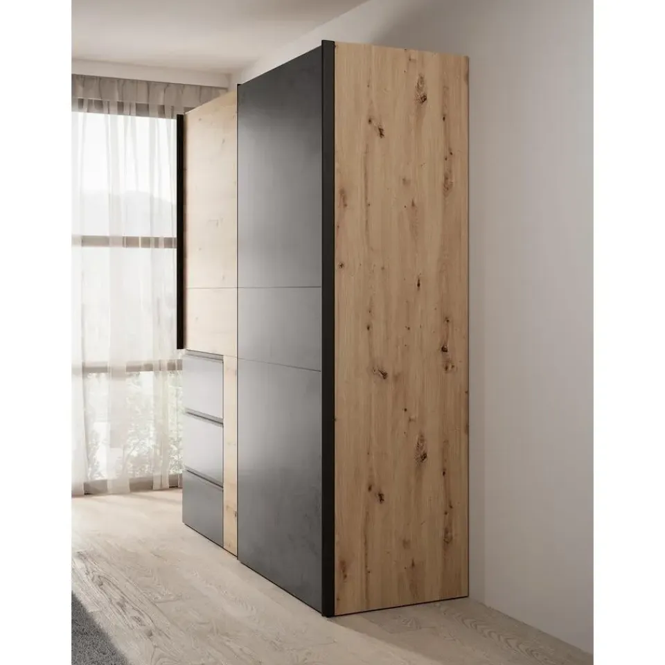 Kledingkast Walter is uitgevoerd in eiken kleur met betonlook grijs. De garderobekast heeft 2 schuifdeuren en 3 greeploze lades. In de binnenkant van de kast vind je 2 kledingroedes en 3 opbergvakken. Het meubel wordt ongemonteerd geleverd. Je dient het dus met behulp van de bijgeleverde handleiding zelf in elkaar te zetten.