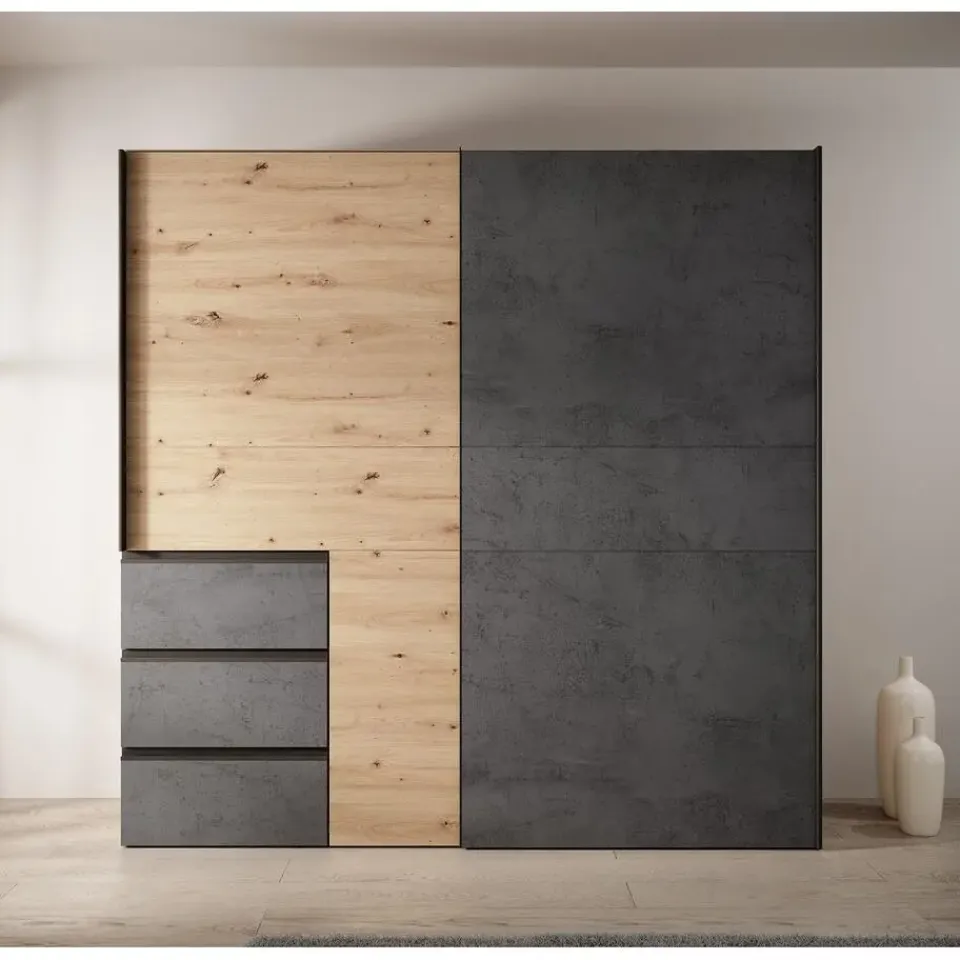 Kledingkast Walter is uitgevoerd in eiken kleur met betonlook grijs. De garderobekast heeft 2 schuifdeuren en 3 greeploze lades. In de binnenkant van de kast vind je 2 kledingroedes en 3 opbergvakken. Het meubel wordt ongemonteerd geleverd. Je dient het dus met behulp van de bijgeleverde handleiding zelf in elkaar te zetten.