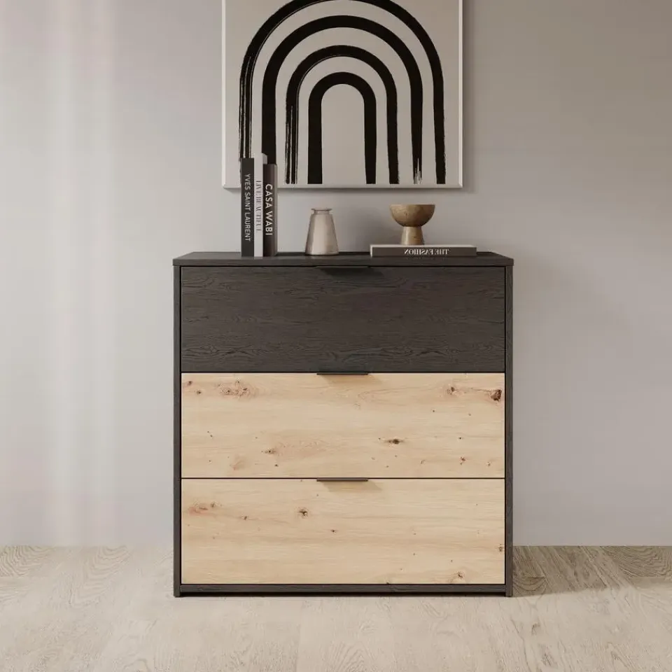 Ladekast Augustus is gemaakt in eiken met zwart eiken kleur. De kast beschikt over 3 lades die openen met zwarte handgrepen. De Augustus past goed in industriële of moderne interieurs. Het meubel wordt ongemonteerd geleverd. Je dient het dus met behulp van de bijgeleverde handleiding zelf in elkaar te zetten.