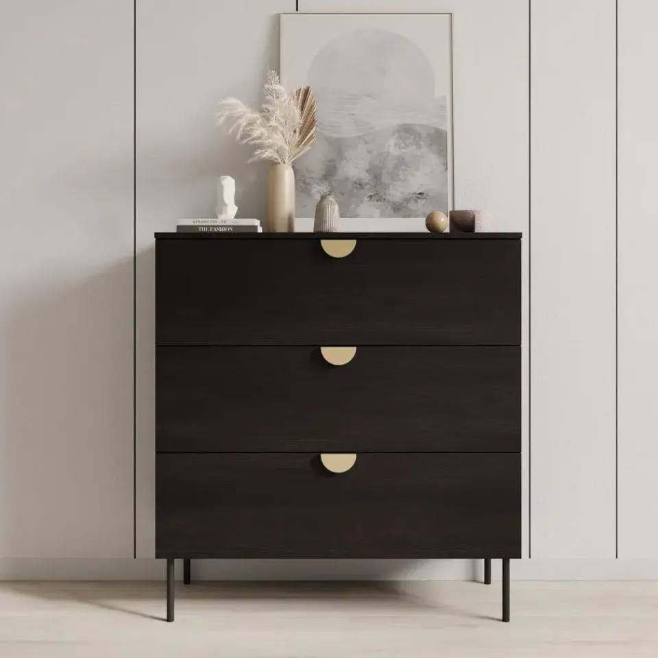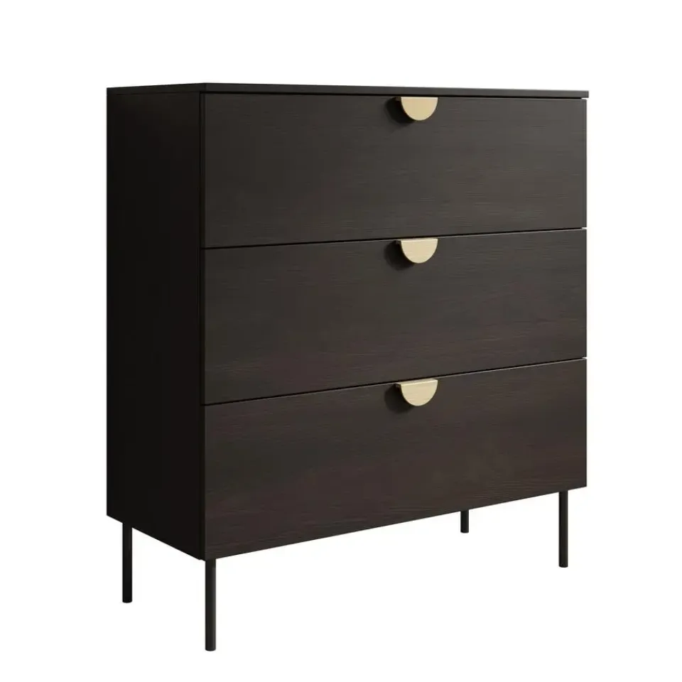 Ladekast Monor beschikt over 3 lades die openen met goudkleurige handgrepen. De Monor heeft een modern, industriële uitstraling en is uitgevoerd in de kleur zwart eiken. Het meubel staat op metalen poten. Het meubel wordt ongemonteerd geleverd. Je dient het dus met behulp van de bijgeleverde handleiding zelf in elkaar te zetten.
