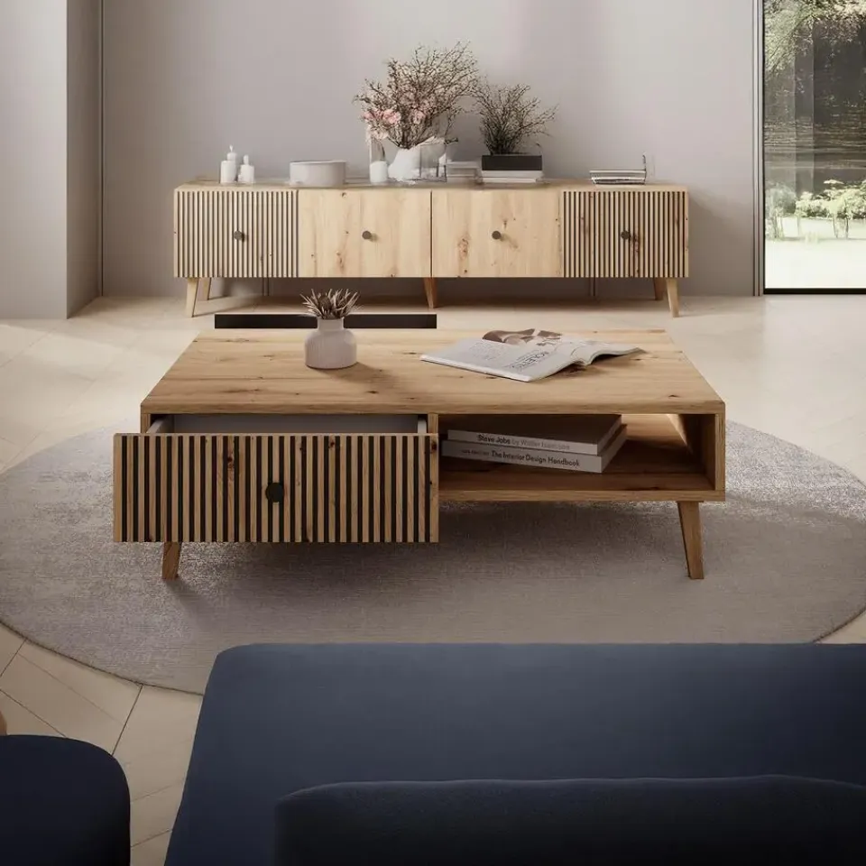 Salontafel Bali is een rechthoekige salontafel in eiken kleur. De tafel beschikt over 2 lades met zwarte handgrepen en staat op hoge pootjes. De voorkant heeft een lattenpatroon. Het meubel wordt ongemonteerd geleverd. Je dient het dus met behulp van de bijgeleverde handleiding zelf in elkaar te zetten.