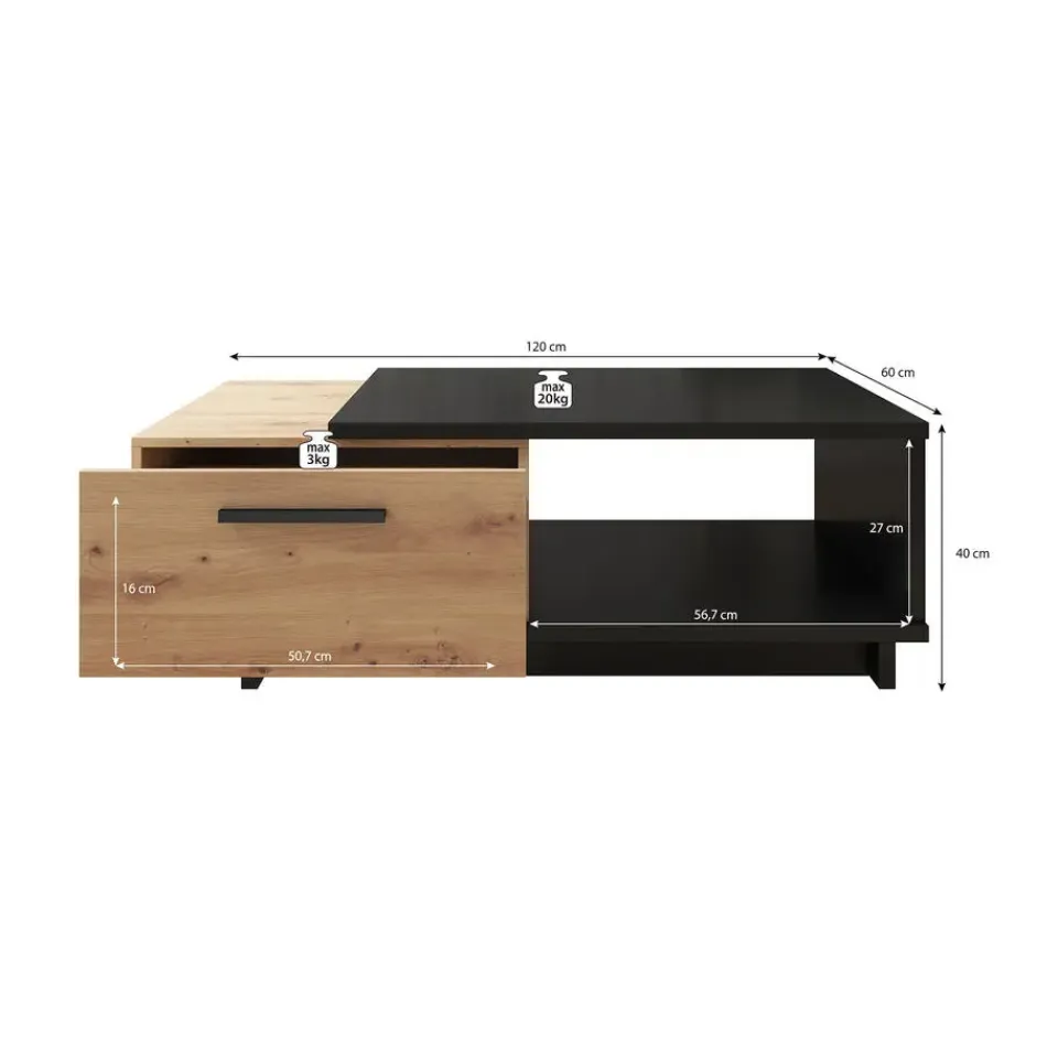 Salontafel Incala beschikt over 2 lades en een groot open vak. De lades zijn te openen met zwarte handgrepen. Het meubel is uitgevoerd in de kleuren eiken met mat zwart. De Incala is gemaakt van een stevige spaanplaat constructie. Het meubel wordt ongemonteerd geleverd. Je dient het dus met behulp van de bijgeleverde handleiding zelf in elkaar te zetten.