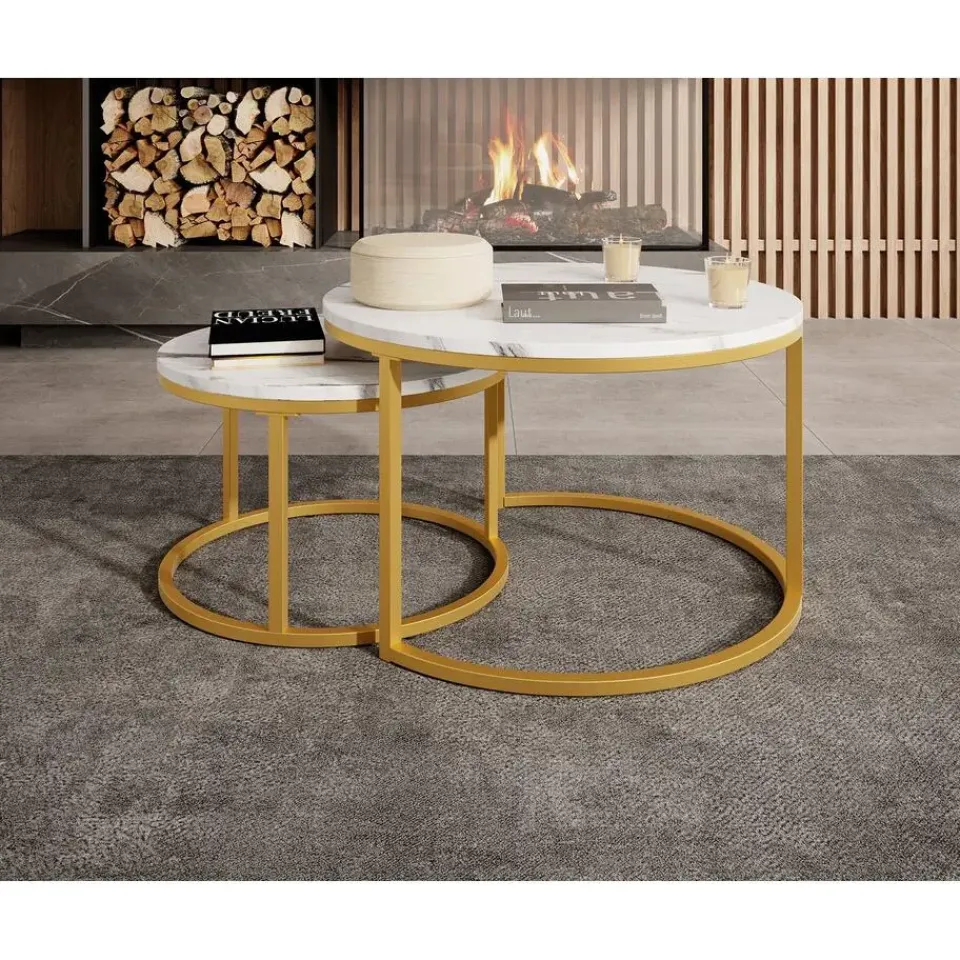 De Rica is een set van 2 ronde salontafels van verschillende afmetingen die je in elkaar kunt schuiven. De tafelbladen hebben een marmerlook en zijn gemaakt van een stevige spaanplaat constructie. Het onderstel is gemaakt van metaal. Het meubel wordt ongemonteerd geleverd. Je dient het dus met behulp van de bijgeleverde handleiding zelf in elkaar te zetten.