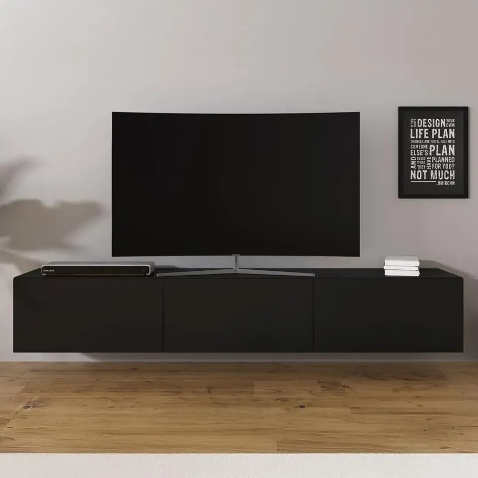 TV-Meubel Bonzo beschikt over 3 greeploze kleppen. Deze openen met een push-to-open systeem. Hierachter zitten 3 opbergvakken. Het meubel is 30 cm hoog. Het meubel wordt ongemonteerd geleverd. Je dient het dus met behulp van de bijgeleverde handleiding zelf in elkaar te zetten.
