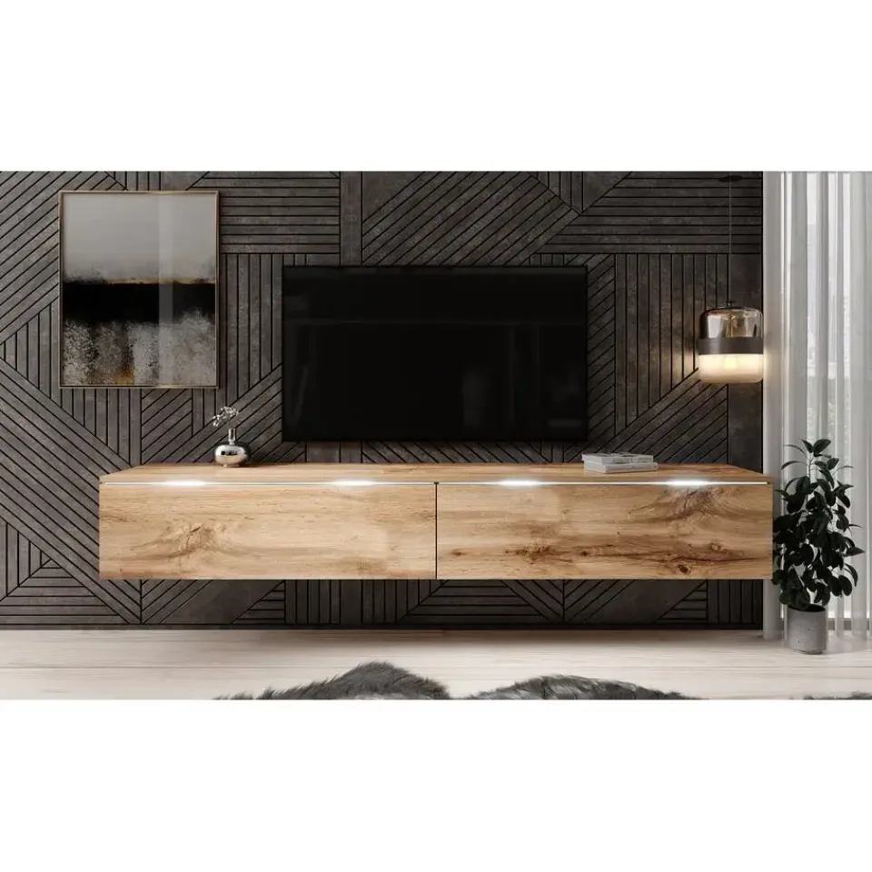 TV-Meubel Dixon heeft 2 greeploze kleppen waarachter 2 opbergvakken zitten. Het meubel is staand of hangend te monteren, het ophangmateriaal en de pootjes worden beide meegeleverd. Het meubel is ook inclusief LED-verlichting. Het meubel wordt ongemonteerd geleverd. Je dient het dus met behulp van de bijgeleverde handleiding zelf in elkaar te zetten.