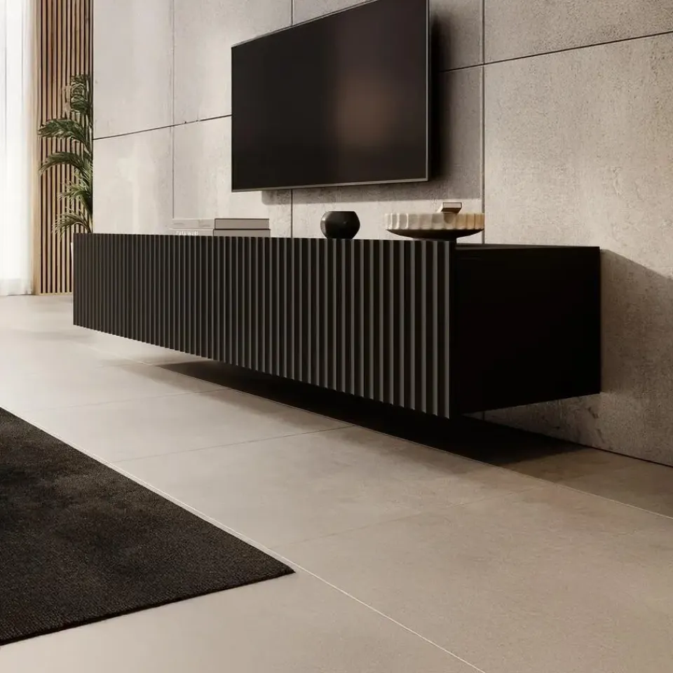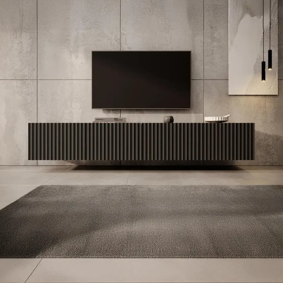 TV-Meubel Pepinos is een hangende tv kast met 4 greeploze deuren waarachter 2 opbergvakken zitten. De voorkant van de deuren hebben een latten-patroon. Het meubel wordt ongemonteerd geleverd. Je dient het dus met behulp van de bijgeleverde handleiding zelf in elkaar te zetten.
