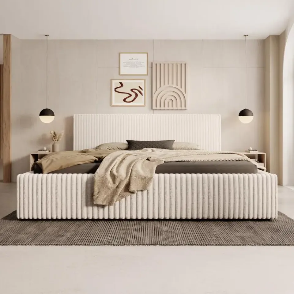 Tweepersoonsbed Infinity is bekleed met beige fluffy ribstof. De Infinity is geschikt voor matrasmaat 180×200 cm. Over het hoofdbord loopt een verticale naar buiten gestikte siernaad. Het meubel wordt ongemonteerd geleverd. Je dient het dus met behulp van de bijgeleverde handleiding zelf in elkaar te zetten.