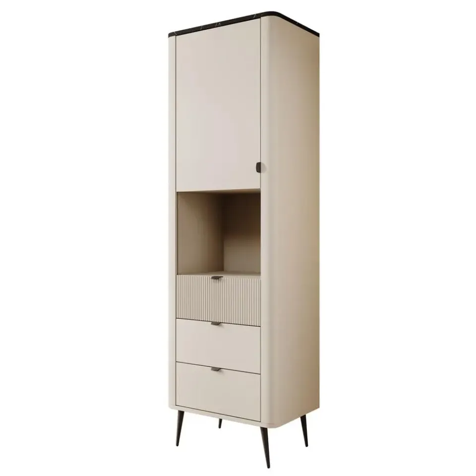 Wandkast Mace is gemaakt in beige kleur en staat op metalen pootjes. De kast beschikt over 3 lades en 1 deur die openen met zwarte handgrepen. Achter de deur zitten 2 opbergvakken en boven de lades zit nog 1 open vak. Het meubel wordt ongemonteerd geleverd. Je dient het dus met behulp van de bijgeleverde handleiding zelf in elkaar te zetten.