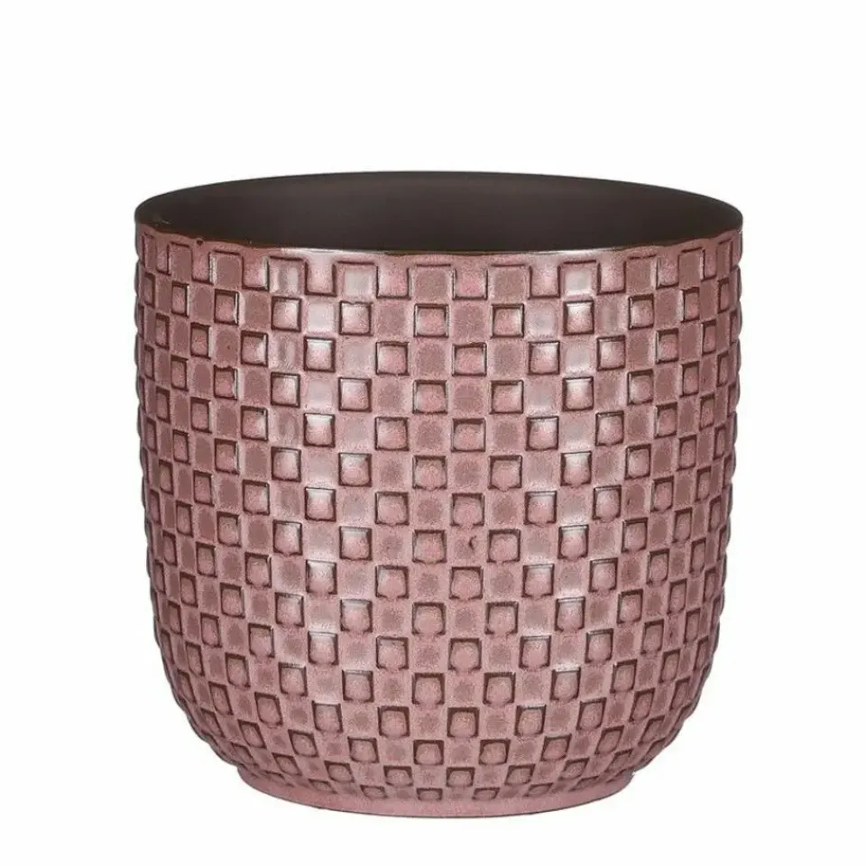 Plantenpot/bloempot van keramiek in de kleur roze met een mooi patroon. Diameter 13.5 cm en hoogte 13 cm. Stijlvolle bloempotten voor binnen gebruik met een glanzende finish. Serie: Daan. Het vierkantjes patroon aan de buitenzijde van de pot geeft het geheel een modieus fraai stijlvol uiterlijk. Handgemaakt keramiek.