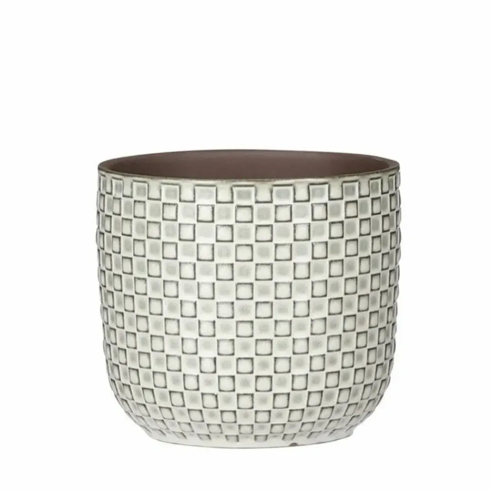 Plantenpot/bloempot van keramiek in de kleur wit met een mooi patroon. Diameter 12 cm en hoogte 11 cm. Stijlvolle bloempotten voor binnen gebruik met een glanzende finish. Serie: Daan. Het vierkantjes patroon aan de buitenzijde van de pot geeft het geheel een modieus fraai stijlvol uiterlijk. Handgemaakt keramiek.