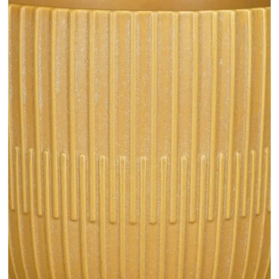 Plantenpot/bloempot van keramiek in de kleur mat okergeel met een mooi verticale strepen patroon. Diameter 10 cm en hoogte 9 cm. Stijlvolle bloempotten voor binnen gebruik. Serie: Sara. De stijlvolle pot met het prachtige patroon aan de buitenzijde is met de hand gemaakt in Portugal. Derhalve is geen pot exact hetzelfde en hebben de bloempotten een echt karakter. Tip: zet een schotel onder de pot om eventueel lekken tegen te gaan. Potten van steen zijn niet 100% waterdicht.