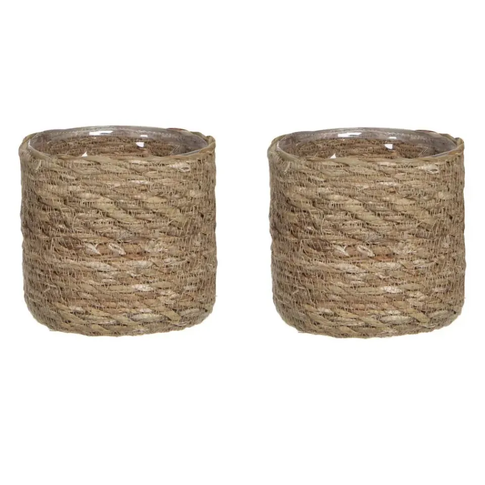 Naturel bruin kleur rotan planten pot mand van gedraaid jute/touw/riet/zeegras van 12 cm hoogte en 12 cm diameter(buitenzijde). Voor de binnenmaat trek je 2 cm af. Mooie rotan jute manden/mandjes voor bloemen, bloemstukjes en planten met plastic aan de binnenkant zodat het water er niet door gaat. De ronde rieten mand heeft geen gaatjes aan de onderkant.