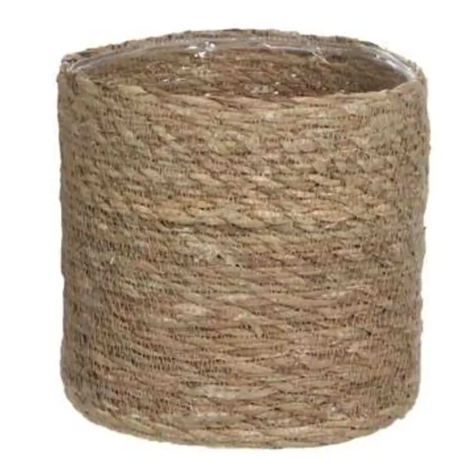 Naturel bruin kleur rotan planten pot mand van gedraaid jute/touw/riet/zeegras van 18 cm hoogte en 18 cm diameter(buitenzijde). Voor de binnenmaat trek je 3 cm af. Mooie rotan jute manden/mandjes voor bloemen, bloemstukjes en planten met plastic aan de binnenkant zodat het water er niet door gaat. De ronde rieten mand heeft geen gaatjes aan de onderkant.