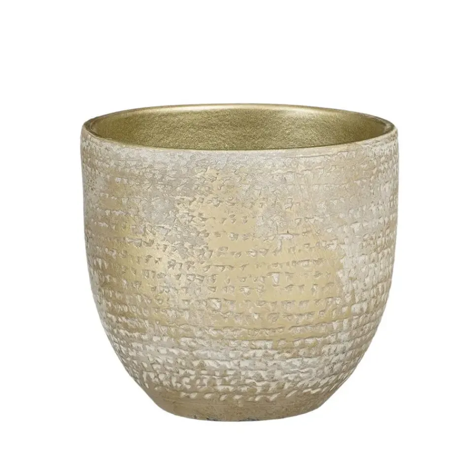 Plantenpot/bloempot van terracotta in de kleur champagne/wit met een modern relief flakes patroon. Diameter 16 cm en hoogte 14 cm. Stijlvolle bloempotten voor binnen gebruik. Serie: Carrie. De zeer mooie potten met prachtige buitenzijde zijn met de hand gemaakt in Portugal. Derhalve is geen pot exact hetzelfde en hebben de bloempotten een echt karakter. Materiaal: Terracotta. Tip: zet een schotel onder de pot om eventueel lekken tegen te gaan. Potten van steen zijn niet 100% waterdicht.