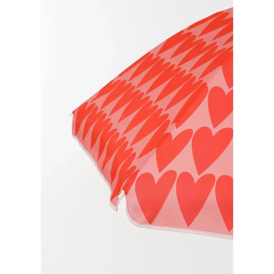 - Frisse roze tinten en een hartjesprint geven de parasol een speels retro accent