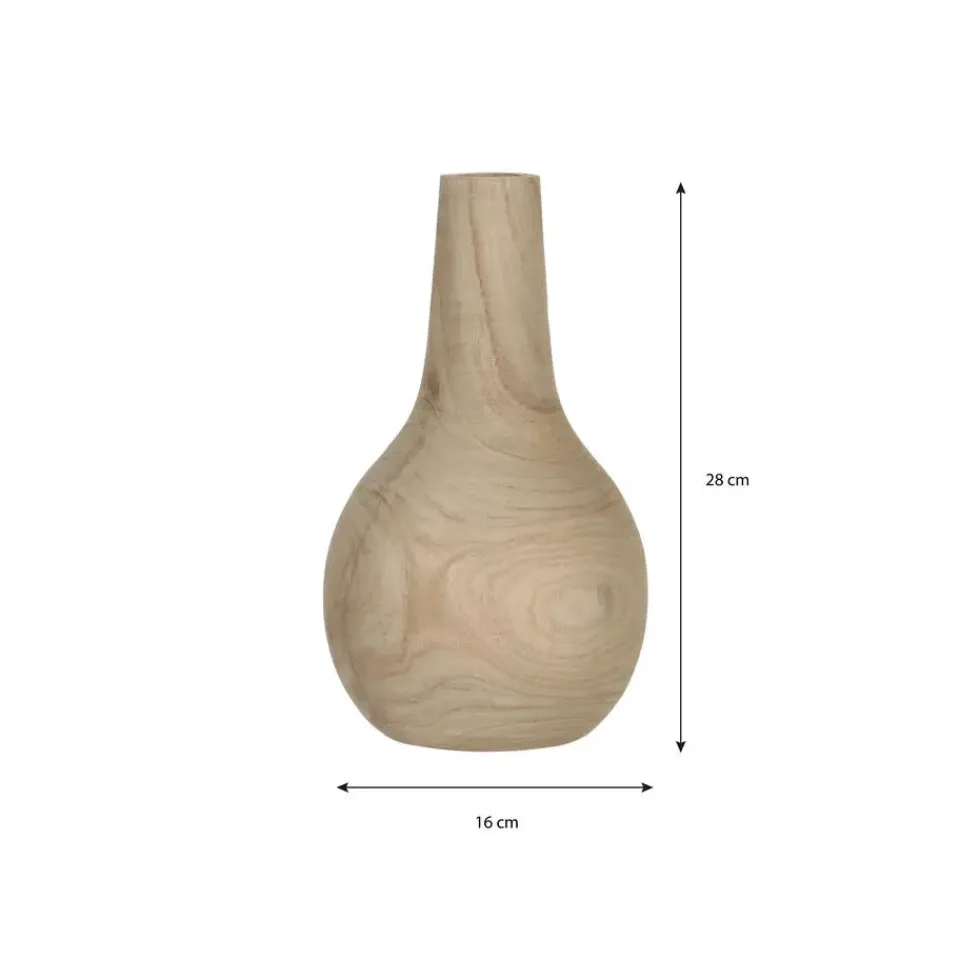 Deze stijlvolle, bolvormige vaas van paulowniahout is een echte blikvanger in je interieur. Met zijn warme bruine kleur, natuurlijke uitstraling en slanke hals geeft hij een sfeervol accent aan elke ruimte. Dankzij de opening van ca. 6 cm is de vaas ideaal voor kleinere bloemen, droogtakken of kunstbloemen, maar minder geschikt voor een vol boeket.