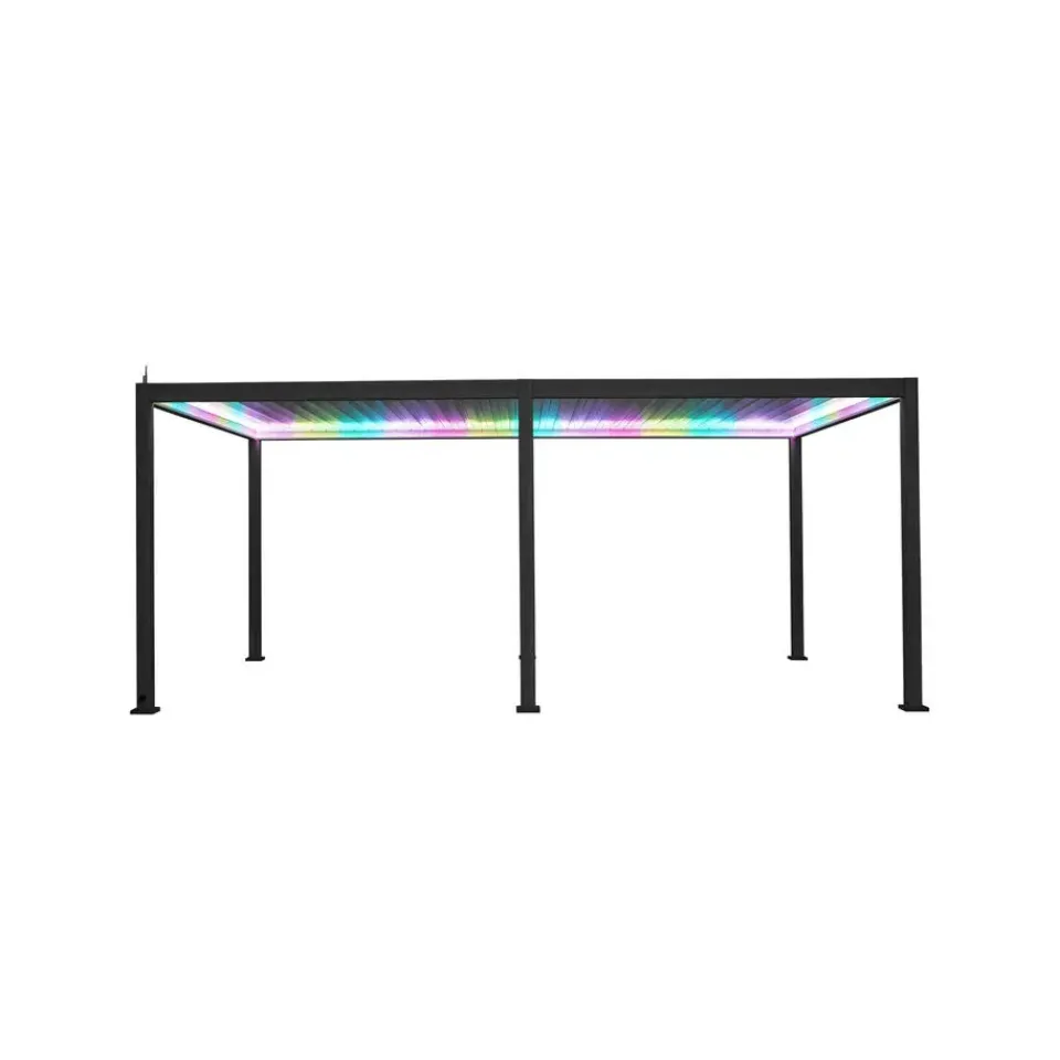 Elektrisch lamellen dak met LED verlichtingDoor het elektrische lamellen dak, heb je altijd de keuze of je in de zon of in de schaduw wilt zitten. De lamellen kunnen 90 graden kantelen waardoor je zeer flexibel bent in het doorlaten van zonlicht. Wanneer het lamellen dak dicht zit, dan is de overkapping 100% waterdicht doordat het water via het geïntegreerde waterafvoersysteem wordt afgevoerd. De overkapping sluit je gemakkelijk aan op een 220V stopcontact. De LED verlichting zorgt voor een aangename en warme sfeer tijdens de avonduren. Het elektrisch lamellen dak en de LED verlichting bedien je gemakkelijk met de afstandsbediening.