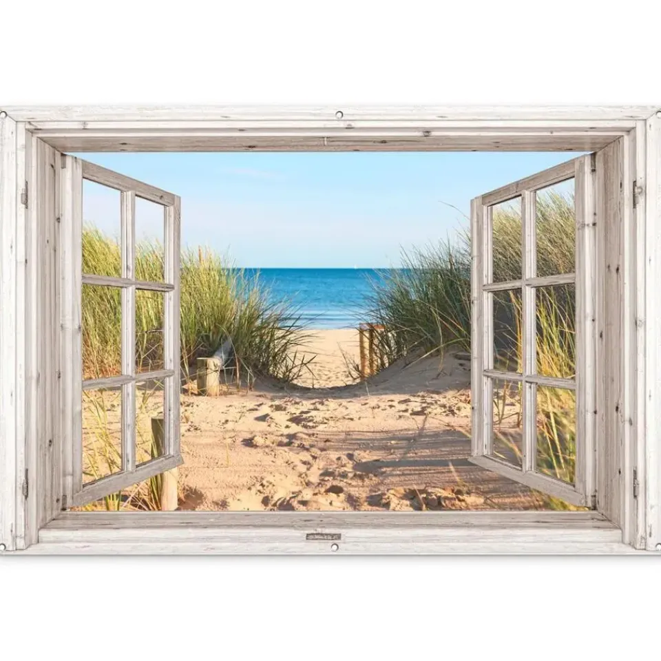 Een houten raam staat open en kijkt uit op de zee.