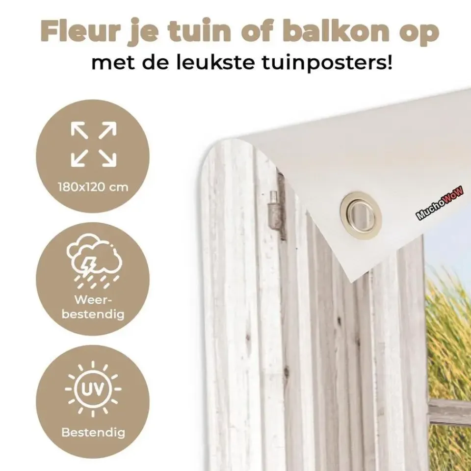 De MuchoWow tuinposter is de ideale manier om meer sfeer aan je tuin te geven. Door middel van de ingezoomde ringen is het tuindoek zeer gemakkelijk op te hangen en blijft hij ook goed hangen in weer en wind. Als je op zoek bent naar een leuke tuindecoratie ben je bij MuchoWow aan het juiste adres.