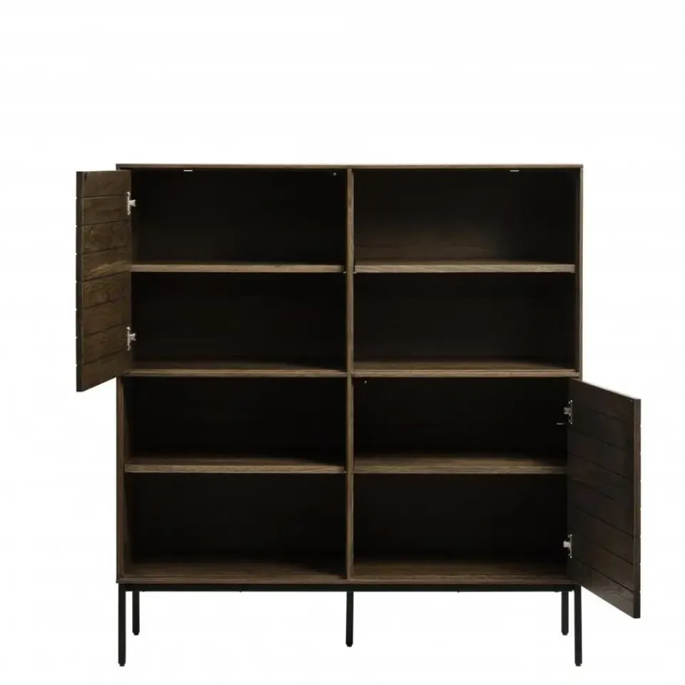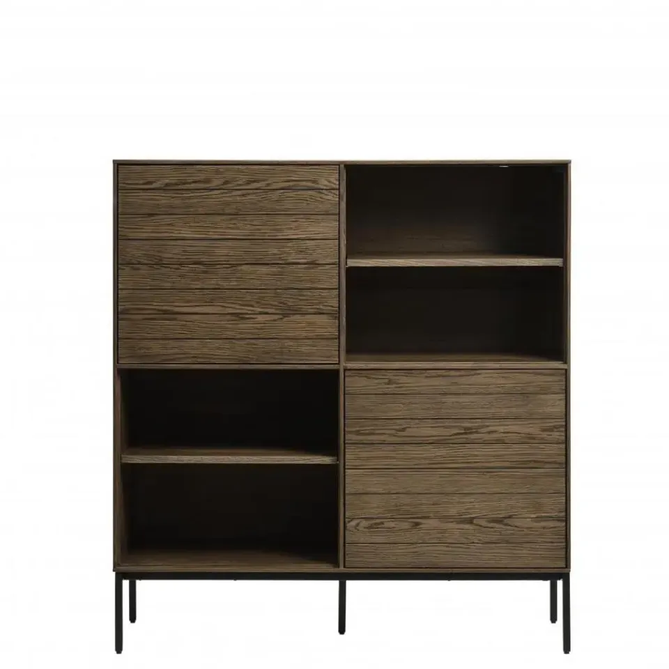 Een warm gerookt eikenhout dat mooi samenspeelt met uitgesneden horizontale rechte lijnen en industriële accenten van zwart metaal, geeft Alec een opvallende lichtheid, een ontwerp versterkt door de eenvoudige push-open deuren en laden.