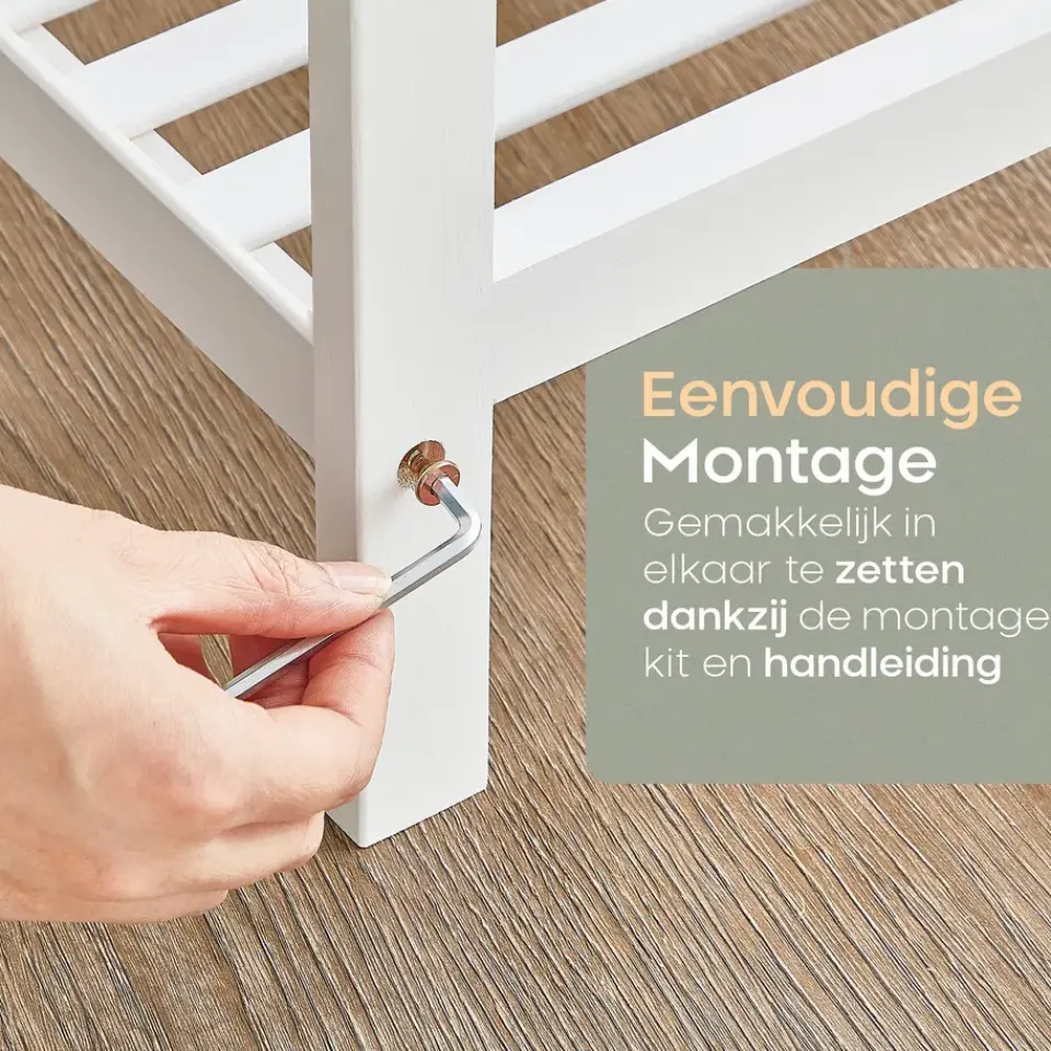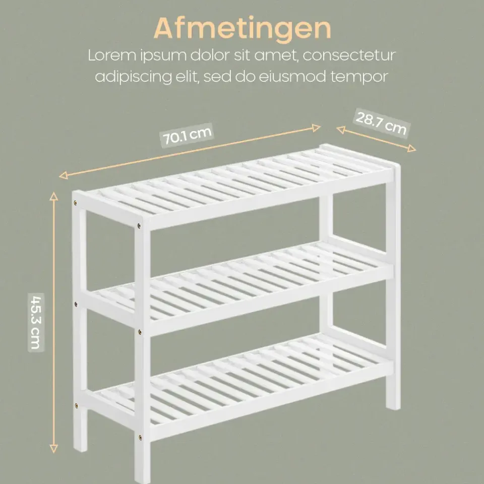 Met afmetingen van 70 x 26 x 55 cm is dit schoenenrek compact genoeg om in kleine ruimtes te passen, zonder dat het aan functionaliteit inboet. Of je nu een extra opbergoplossing zoekt voor in je hal, slaapkamer of badkamer, dit rek voor schoenen past overal. Gebruik het zelfs als opbergrek voor handdoeken in je badkamer of als mini-boekenplank in de slaapkamer.
