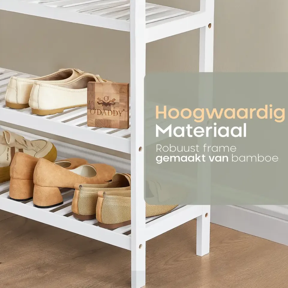 Bij O’DADDY® houden we van milieuvriendelijke oplossingen, en daarom is dit betaalbare schoenenrek gemaakt van bamboe. Dit materiaal is niet alleen ecologisch verantwoord doordat het snel hernieuwbaar is, maar het heeft ook een prachtige natuurlijke uitstraling. Daarnaast staat bamboe bekend om zijn stevigheid, wat ervoor zorgt dat elk niveau een gewicht van maximaal 10 kg kan dragen. Perfect voor zware laarzen of andere voorwerpen.