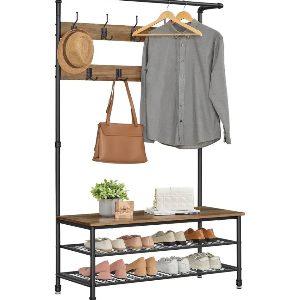 De combinatie van gepoedercoat metaal en hout in een rustieke stijl zorgt voor een stevig en duurzaam meubel. Het metaal is beschermd tegen roest, terwijl de houten planken een stijlvolle en beschermende fineerlaag hebben. De bank biedt niet alleen een comfortabele zitplek, maar kan ook tot 100 kg dragen, waardoor hij perfect is voor dagelijks gebruik. De stevige haken kunnen elk tot 3 kg dragen, zodat ook zware winterjassen gemakkelijk opgehangen kunnen worden.