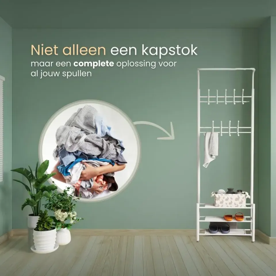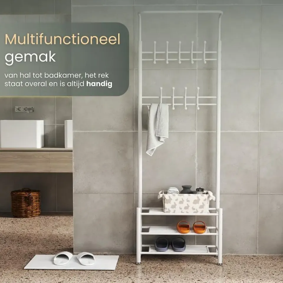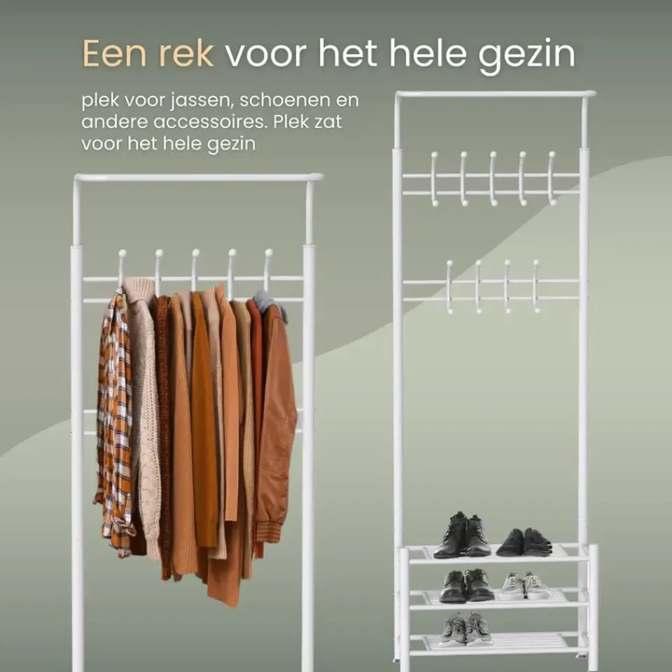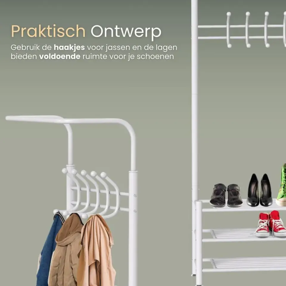- Multifunctioneel ontwerp voor jassen, hoeden, schoenen en meer.