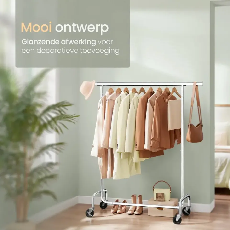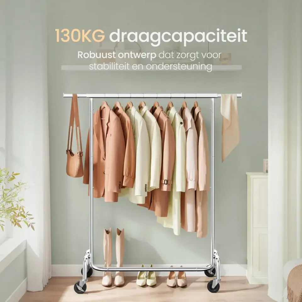 Dit kledingrek is uitgerust met vier robuuste zwenkwielen, waarvan twee met een remfunctie. Dit maakt het eenvoudig om het rek te verplaatsen, zelfs wanneer het volledig beladen is. Het rek is daarom perfect voor dynamische omgevingen zoals modeshows, kledingwinkels of dagelijks gebruik thuis. De onderste dwarsbalk biedt extra bergruimte voor schoenen of opbergdozen, wat het ordenen van ruimtes verder vergemakkelijkt.