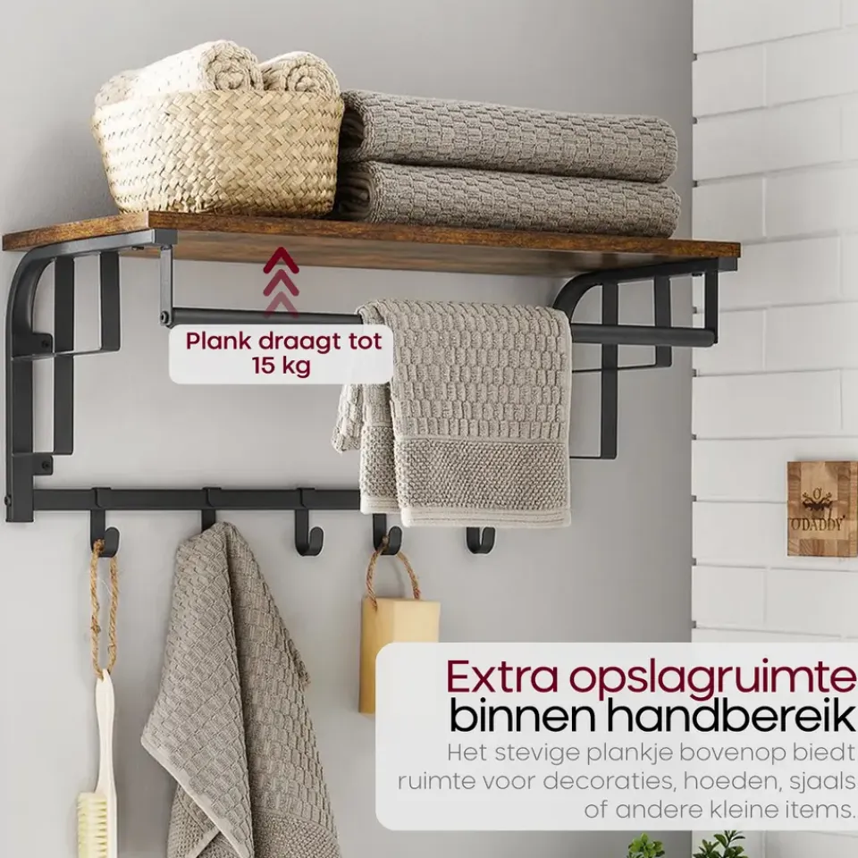 - Drie-in-één design met plank, ophangrail en 5 haken voor al je spullen.