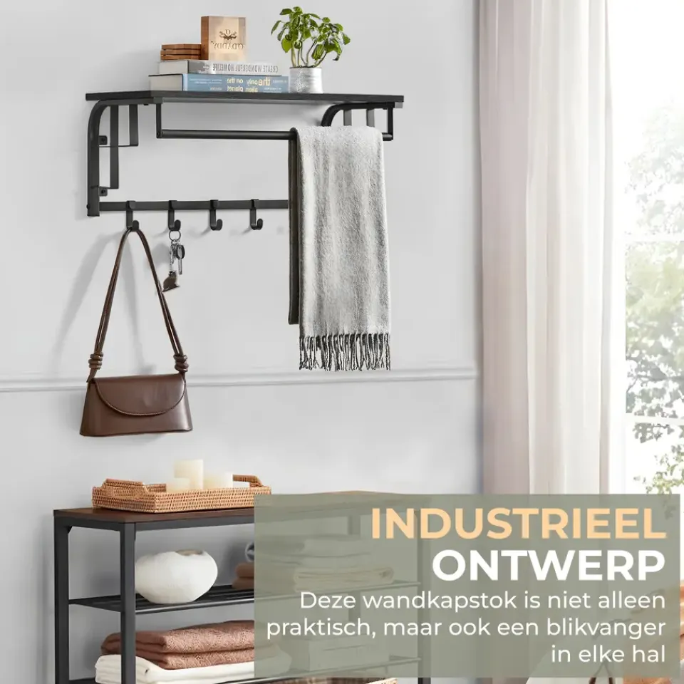 Heb je ook die lege muur in je hal waar je altijd iets nuttigs van wilt maken? De O’DADDY® wandkapstok biedt de perfecte oplossing. Met een robuust metalen frame, een rustieke plank en 5 haken is deze kapstok ideaal om jassen, hoeden, tassen en sleutels netjes op te bergen. De extra ophangrail maakt het mogelijk om kledinghangers te gebruiken, zodat je zelfs delicate kledingstukken georganiseerd kunt houden. Dit alles in een industrieel design dat past in elke moderne ruimte.