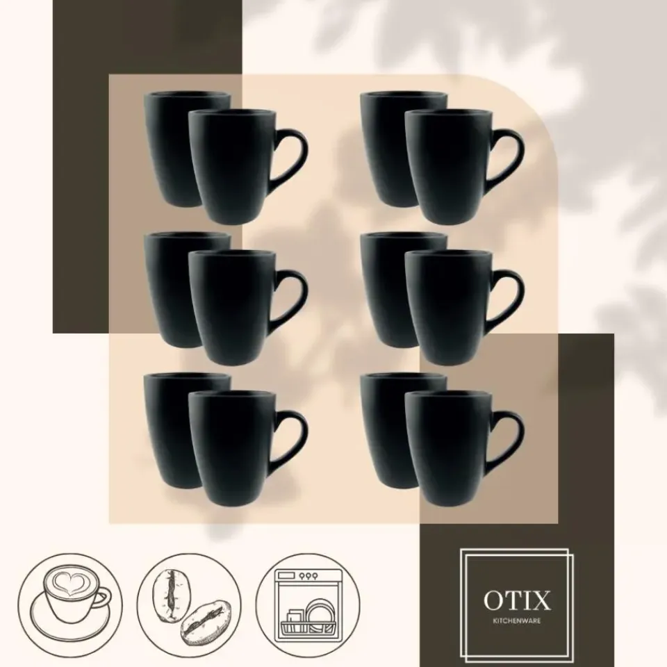 Deze koffiekopjes matzwart van OTIX hebben een mat zwarte afwerking. De crème kleurige binnenkant geven de koffiekopjes een strakke uitstraling. De kopjes hebben een inhoud van 340 ml. Hiermee zijn de koffiekopjes goed te gebruiken voor zowel koffie als thee. De kopjes worden geleverd in een set van 12.