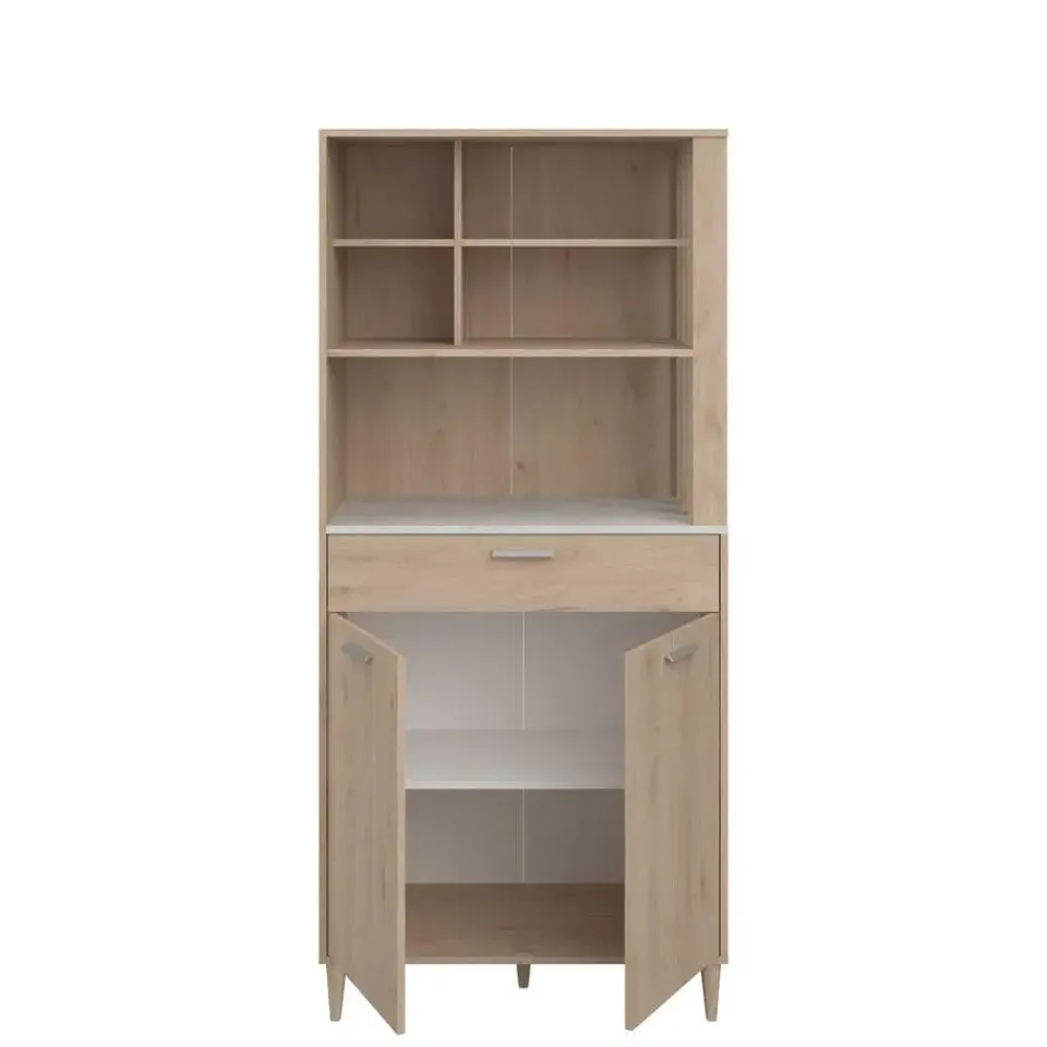 Met de collectie Galatee combineer je moeiteloos stijl en functionaliteit in je keuken. De meubels zijn gemaakt uit spaanplaat en zijn afgewerkt in melamine. De combinatie van licht eikdecor en wit geeft de collectie een eigentijdse look, die perfect past in de Scandinavische stijl. Het ontwerp met latjes aan de zijkant zorgt voor een open sfeer. Deze buffetkast is onderaan uitgerust met twee deuren, waarachter een legplank is voorzien. Hierdoor kan je allerlei keukenspullen netjes en uit het zicht opbergen. In de lade heb je ruimte voor allerlei kleinere keukenspullen, zoals bestek. De vijf open opbergvakken bovenaan zijn ideaal om je leukste servies of kookboeken uit te stallen, of om je kleinere keukenapparatuur op te plaatsen, zoals je microgolfoven of koffiezetapparaat. Ontdek de volledige collectie Galatee op onze website.
