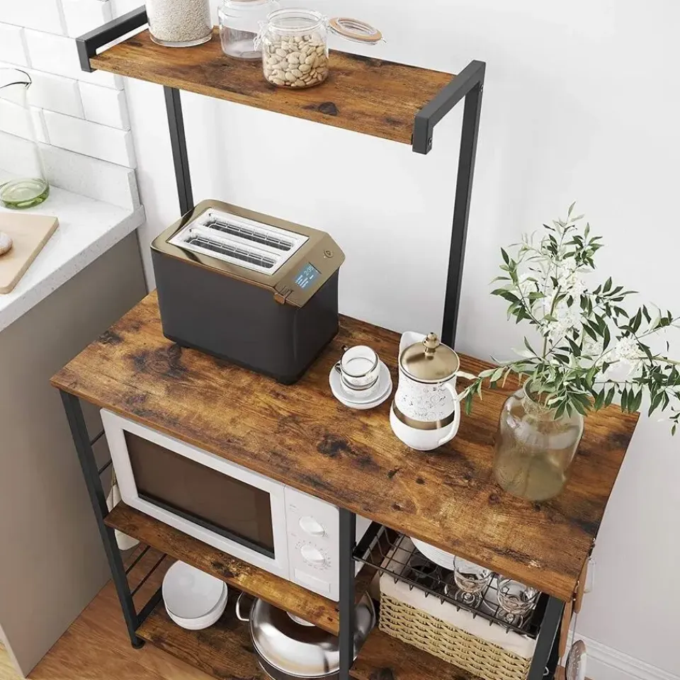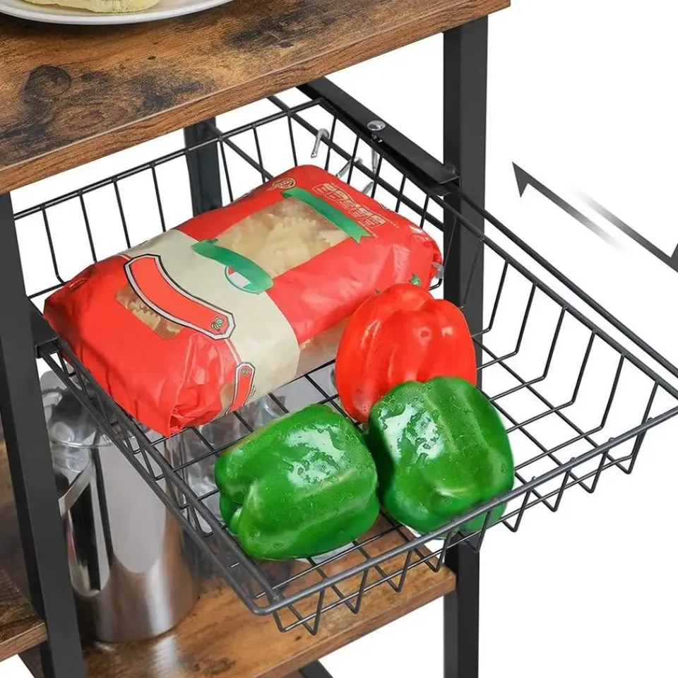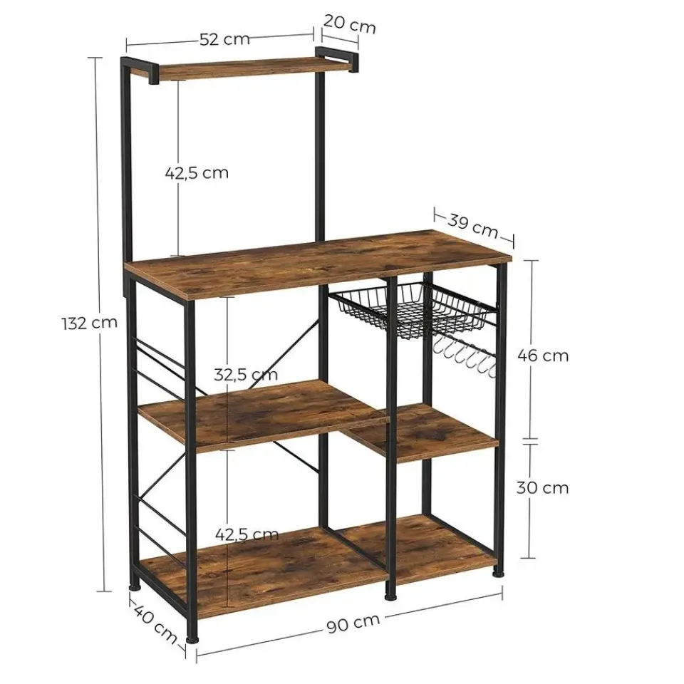 Handige kast die enorm veel ruimte biedt voor het opbergen van pannen, kruiden, handdoeken, theedoeken en flessen drank. Het frame bestaat uit een ijzeren frame en hout, wat zorgt voor goede ondersteuning, onder het rek zitten verstelbare poten die ervoor zorgen dat het geheel op zijn plek blijft staan, zelfs op een ongelijkmatige vloer.