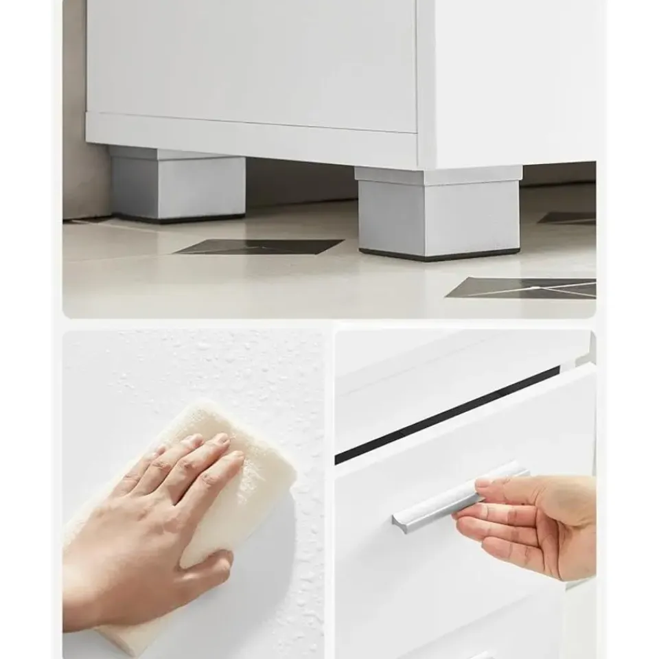 Het oppervlak van de badkamerkast is eenvoudig schoon te maken: een simpel veegje met een doek is voldoende. Bovendien zorgen de praktische voeten ervoor dat de kast beschermd blijft tegen water op de vloer, waardoor hij er langer als nieuw uitziet.