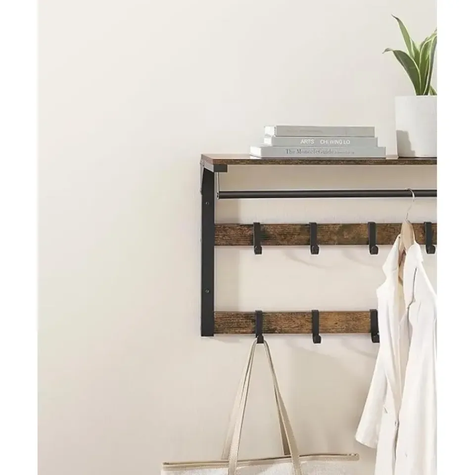 Multifunctioneel ontwerp – Deze 3-in-1 wandkapstok combineert een bovenste plank, afneembare haken en een ophangstang, zodat je eenvoudig kleding kunt ophangen, accessoires kunt opbergen en kleine spullen kunt neerzetten.