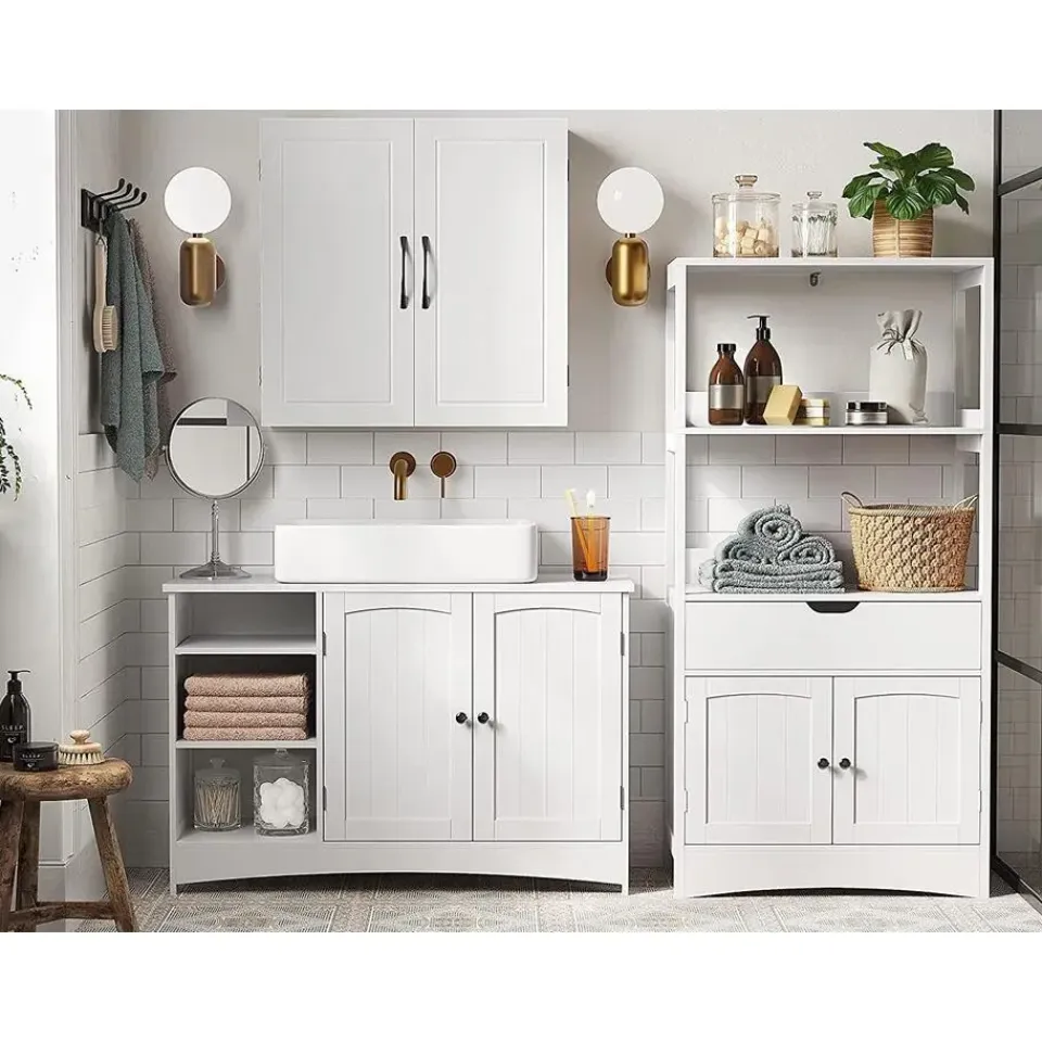 De wastafelmeubel van Parya Home is gemaakt van hoogwaardige MDF-platen. Deze platen zorgen voor een aangenaam glad en een onderhoudsvriendelijk oppervlak. De kast is voorzien van schimmelbestendig materiaal en is hierdoor bestand tegen schimmel en vocht. Ook is de kast eenvoudig schoon te maken. De witte kleur, de kastdeuren met speciale groeven en de verchroomde metalen handgrepen geven dit badkamermeubel een frisse uitstaling en past daarom in bijna elke badkamer.