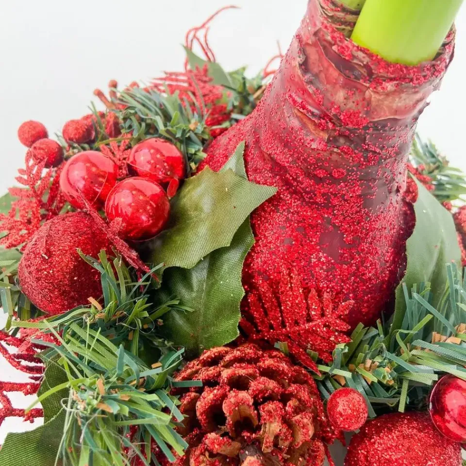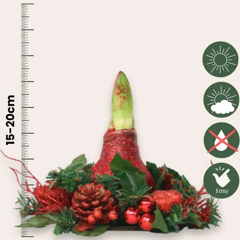 Haal de wintersfeer in huis met de Amaryllis! De prachtige, stijlvolle rode bloemen stelen de show in jouw winterinterieur. De prachtige bloemen hebben een bloeitijd van 3 tot 6 weken. De bollen zijn ongeveer 32cm in omtrek en worden met een glamoreus zilver, goud en rood glitter waslaagje geleverd in feestelijke kerstkransjes.