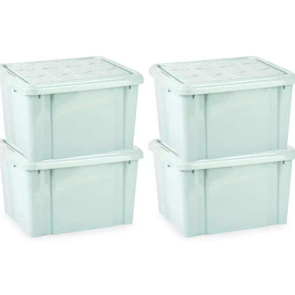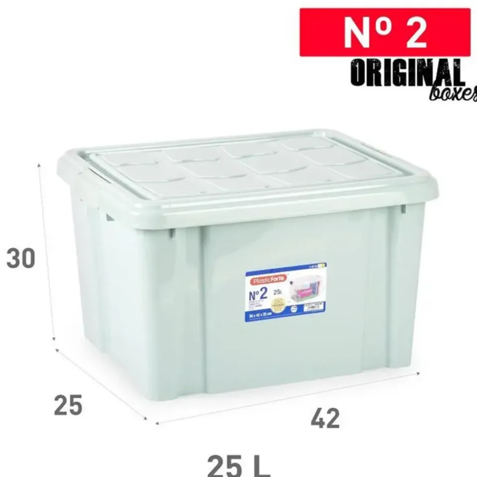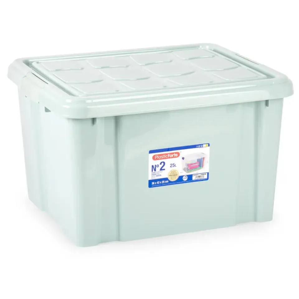 Opslagbox/kist met zijklem deksel met een inhoud van 25 liter. De opslagbox / opbergbox is in de kleur mintgroen en is gemaakt van stevig kunststof. Afmetingen: 42 x 25 x 30 cm. Handige spullen/kleding/speelgoed/gereedschap/kerstartikelen bewaar box. Stapelbaar en nestbaar bij meerdere stuks. Merk: Plasticforte.