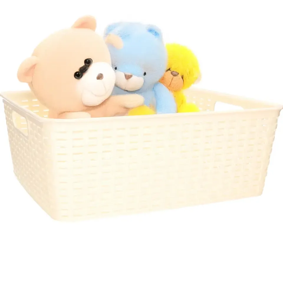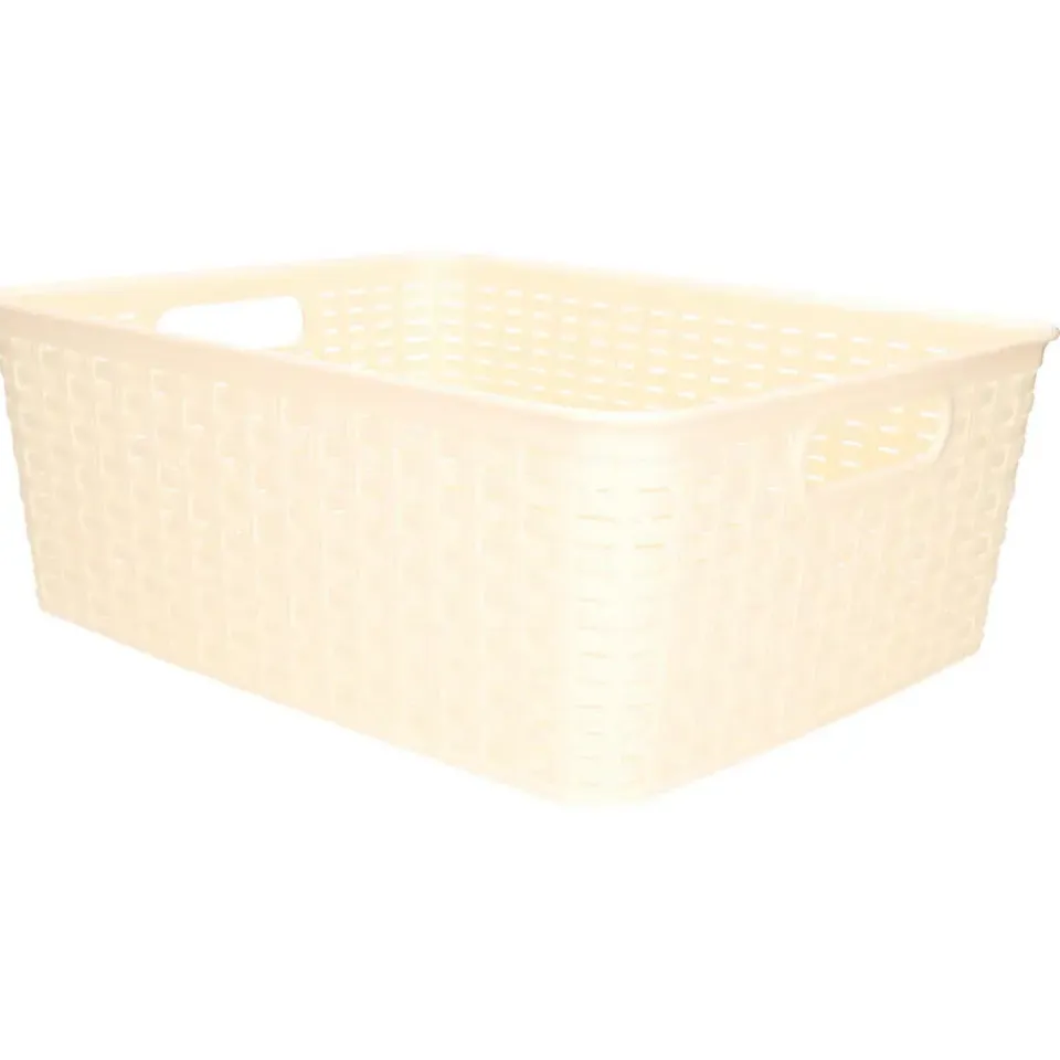Opbergmand/kastmand gemaakt van rotan gevlochten kunststof in de kleur zacht geel. Deze manden zijn kast-organisers of zijn prima in de woonkamer, badkamer, keuken of slaapkamer plaatsen. De mandjes zijn bijvoorbeeld geschikt voor het opbergen van speelgoed, kleding stukken, kantoor spullen, etenswaren en het opbergen van diverse spullen. Formaat: ongeveer 30 x 37 x 13 cm. Inhoud: 12 liter.