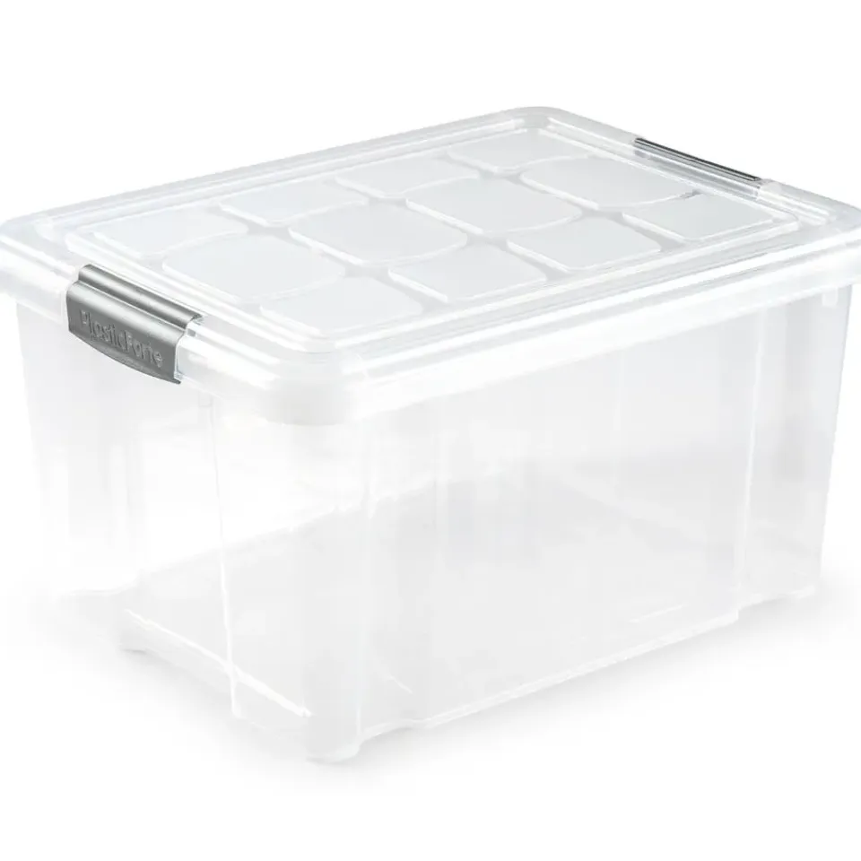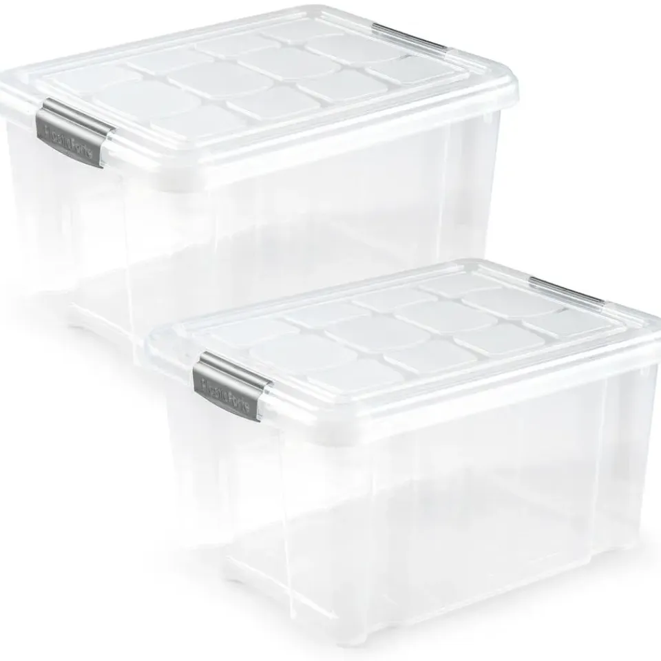 Opslagbakken/organizers van stevig kunststof met deksel. Transparante opbergbakken met deksel welke is voorzien van grijze sluitclips. Handig voor het opbergen van spullen. Inhoud: ca. 25 liter. Formaat: 42 x 36 x 25 cm. Materiaal: kunststof (plastic).