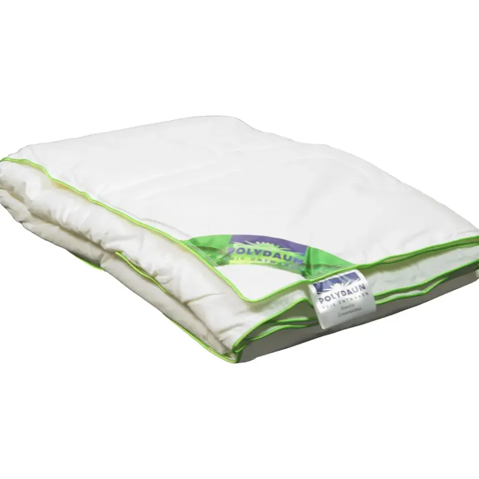 Polydaun zomerdekbed Bamboe heeft een bamboe vulling en een afmeting van 140×220 cm. Bamboe biedt optimale vochtregulatie voor dat extra uurtje slaap. In de zomer slapen we vaak net iets korter dan we zouden willen. Ga je te vroeg naar bed, dan slaap je in de hitte en ben je al wakker als het nog lekker koel is. Ga je pas slapen als het koeler is, dan mis je die belangrijke uren voor je herstel. Daar heeft Polydaun een oplossing voor bedacht: het bamboe dekbed. Het bamboe dekbed is het luxe alternatief voor het katoenen zomerdekbed. Bamboe voelt van nature koel aan, maar is ook licht in gewicht en daarom uitermate geschikt voor warme nachten. Bamboe heeft ook een uitstekende ventilatie en vochtregulatie en neemt maar liefst 40 procent meer vocht op dan katoen! Hierdoor worden bacteriën en schimmels geweerd en behoort klam wakker worden tot de verleden tijd. De zachte 100 procent perkal katoenen tijk voelt uiterst zacht aan, transpiratievocht wordt afgevoerd voordat het in de vulling kan trekken. Het stiksel heeft de vorm van een prachtige bamboestengel in reliëf. Het bamboe dekbed is eenvoudig wasbaar op 30C.