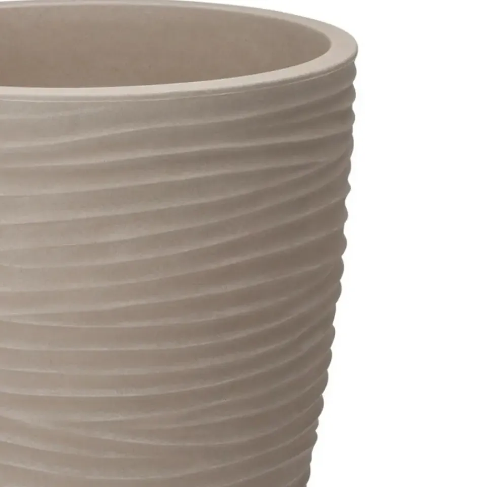 Plantenpot/bloempot Dunes gemaakt van stevig kunststof(Polyethyleen) in de kleur zand/beige met ribbel strepen aan de buitenzijde. Deze mooie bloempot uit de Dunes serie is een schitterende toevoeging aan uw tuin/terras. De pot is dubbelwandig. Voor buiten gebruik. Afmetingen: D40 x H60 cm.
