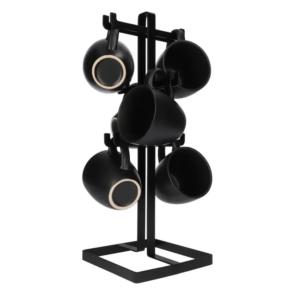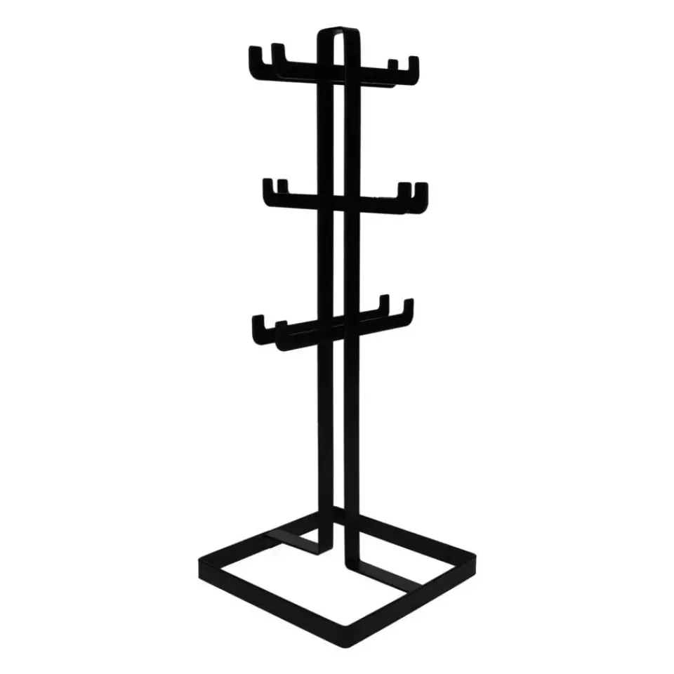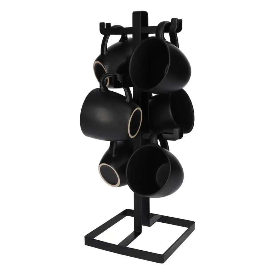 Wil jij ook nooit meer in het keukenkastje hoeven zoeken naar je favoriete mok? Met dit praktische kopjesrek van QUVIO is dat verleden tijd. Dit staande kopjesrek biedt plaats aan al je favoriete bekers. Hang de mokken eenvoudig aan de haken en pak keer op keer probleemloos een kopje. Dit keukenaccessoire is uitgevoerd in zwart metaal, waardoor het niet alleen een praktisch, maar ook een stijlvol keukenaccessoire is. Vul het rek met kleurrijke of juist zwart-witte kopjes voor een uniek effect.