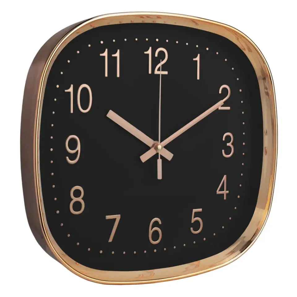 De wandklok heeft roségoud als accentkleur. De wijzerplaat zelf iszwartmet daarop de twaalf cijfers in roségoud, net als de wijzers en het frame. Om nog preciezer de tijd te kunnen lezen zijn er rondom roségouden stippen. Hiermee zie je goed waar de wijzer precies staat.