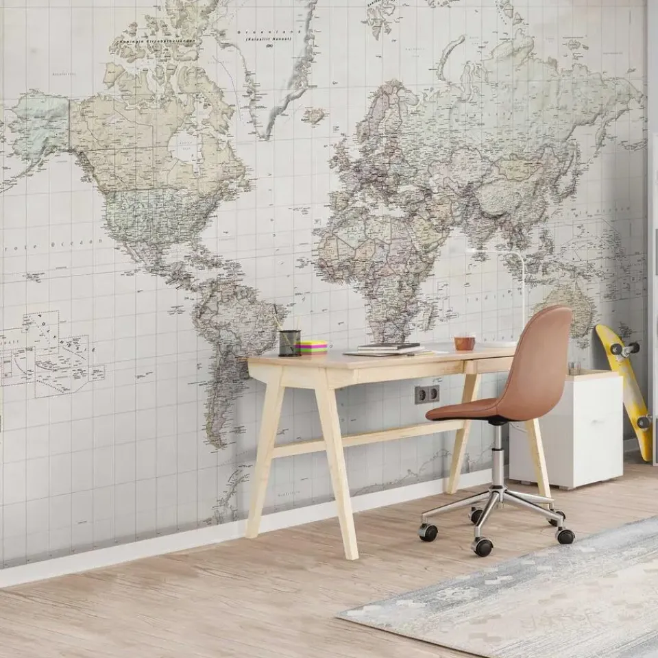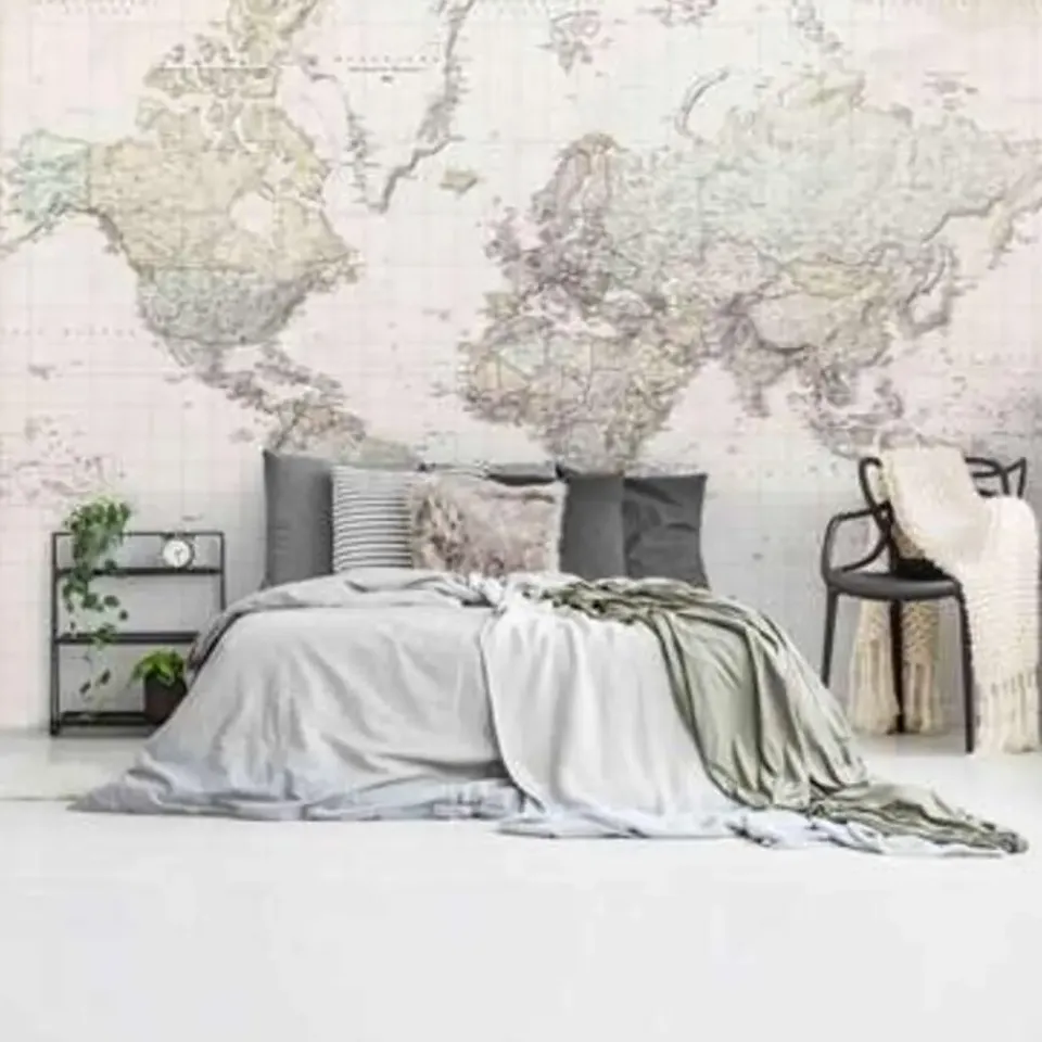 Nederlandstalige wereldkaart in trendy vintage kleuren. De meeste wereldkaarten met deze kwaliteit zijn in het Engels, deze niet. 100% in het Nederlands, mooi en educatief! Met ons fotobehang creëer je een totaal andere sfeer in je kamer of op kantoor! Kies voor een prachtig uitzicht, natuur, een wereldkaart of een cityscape van New York; fotobehang zal de eyecatcher in je woonruimte zijn. Kenmerken